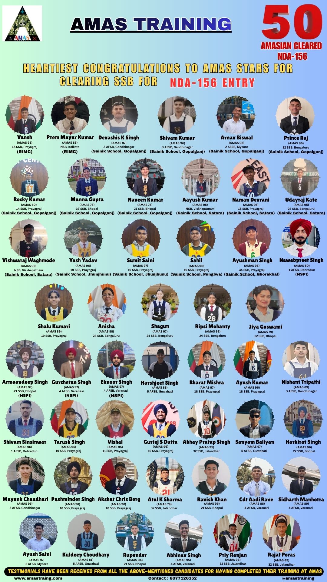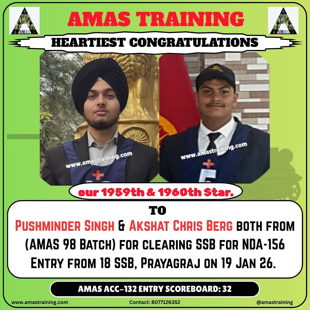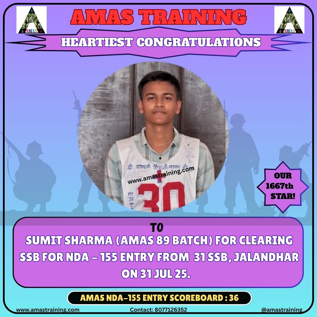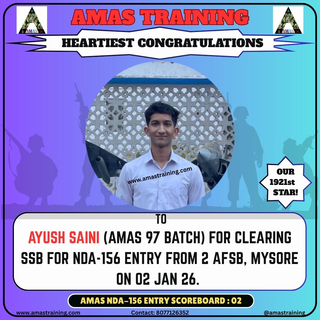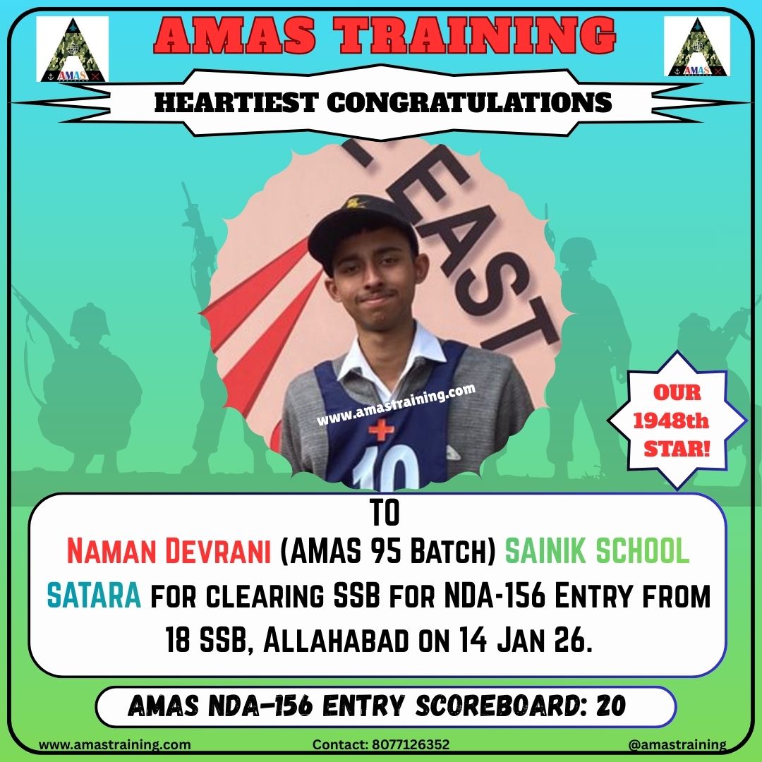 Heartiest Congratulations To: *****SAGAR KUMAR for getting recommended from 21 SSB, BHOPAL on 14 FEB 2026 for CDS(IMA)Entry*****SHIVAM YADAV for getting recommended from 21 SSB, BHOPAL on 14 FEB 2026 for CDS(IMA)Entry*****HIMANSHU for getting recommended from 32 SSB, JALANDHAR on 09 FEB 2026 for TES-55 Entry*****ANKIT KUMAR SINGH for getting recommended from 22 SSB, BHOPAL on 15 FEB 2026 for CDS(IMA)Entry*****APOORVA SAHU for getting recommended from 32 SSB, JALANDHAR on 15 DEC 2025 for SSCW(T) Entry*****SATYAM JHA for getting recommended from 11 SSB, PRAYAGRAJ on 10 JAN 2026 for NDA-156 Entry*****DIVYANSH RANA for getting recommended from 5 AFSB, GUWAHATI on 23 JAN 2026 for NDA-156 Entry*****PRARET SINGH for getting recommended from 17 SSB, BENGALURU on 12 FEB 2026 for CDS(IMA) Entry*****DIP MONDAL for getting recommended from 20 SSB, BHOPAL on 07 FEB 2026 for CDS(IMA) Entry*****ABHIMANYU YADAV for getting recommended from 31 SSB, JALANDHAR on 07 FEB 2026 for CDS(IMA) Entry*****ROHAN for getting recommended from 31 SSB, JALANDHAR on 07 FEB 2026 for CDS(IMA) Entry*****HIMANSHU SHARMA for getting recommended from 1 AFSB, DEHRADUN on 06 FEB 2026 for AFCAT Entry*****ABHISHEK YADAV for getting recommended from 4 AFSB, VARANASI on 07 FEB 2026 for AFCAT Entry*****PREM MAYUR KUMAR of RIMC for getting recommended from NSB, KOLKATA on 10 JAN 2026 for NDA-156 Entry*****KARAN SINGH for getting recommended from 1 AFSB, DEHRADUN on 06 FEB 2026 for AFCAT Entry*****ABHAY THAKUR for getting recommended from 1 AFSB, DEHRADUN on 06 FEB 2026 for AFCAT Entry*****KESHAV SAINI for getting recommended from 1 AFSB, DEHRADUN on 06 FEB 2026 for AFCAT Entry*****ASHUTOSH SHARMA for getting recommended from 22 SSB, BHOPAL on 06 FEB 2026 for CDS(IMA) Entry*****ANURAG SINGH for getting recommended from 20 SSB, BHOPAL on 02 FEB 2026 for CDS(IMA) Entry******PRIYANSHU SINGH for getting recommended from 20 SSB, BHOPAL on 02 FEB 2026 for CDS(IMA) Entry*****RAJAT PORAS for getting recommended from 32 SSB, JALANDHAR on 25 JAN 2026 for NDA-156 Entry*****GURCHETAN SINGH for getting recommended from 4 AFSB, VARANASI on 30 JAN 2026 for NDA-156 Entry*****JIYA GOSWAMI for getting recommended from 22 SSB, BHOPAL on 27 JAN 2026 for NDA-156 Entry*****RIPSI MOHANTY for getting recommended from 24 SSB, BENGALURU on 31 JAN 2026 for NDA-156 Entry*****SHAGUN for getting recommended from 24 SSB, BENGALURU on 31 JAN 2026 for NDA-156 Entry*****ANISHA for getting recommended from 24 SSB, BENGALURU on 31 JAN 2026 for NDA-156 Entry*****NAVEEN KUMAR of SAINIK SCHOOL GOPALGANJ for getting recommended from 21 SSB, BHOPAL on 26 JAN 2026 for NDA-156 Entry*****SAHIL CHIKARA for getting recommended from NSB, VIZAG on 30 JAN 2026 for NAVY (GSX) Entry*****MANISH KUMAR for getting recommended from 32 SSB, JALANDHAR on 30 JAN 2026 for CDS(IMA) Entry*****ABHAY SHARMA for getting recommended from 32 SSB, JALANDHAR on 30 JAN 2026 for CDS(IMA) Entry*****ABHAY SINGH for getting recommended from 18 SSB, PRAYAGRAJ on 29 JAN 2026 for CDS(IMA) Entry*****RITESH PUNDIR for getting recommended from 33 SSB, BHOPAL on 29 JAN 2026 for CDS(INA) Entry*****PRINCE CHAUDHARY for getting recommended from 14 SSB, PRAYAGRAJ on 28 JAN 2026 for CDS(IMA) Entry*****JAYESH PARATE for getting recommended from NSB, VIZAG on 25 JAN 2026 for CDS(INA) Entry*****PRIY RANJAN for getting recommended from 32 SSB, JALANDHAR on 25 JAN 2026 for NDA-156 Entry*****ABHINAV SINGH for getting recommended from 4 AFSB, VARANASI on 23 JAN 2026 for NDA-156 Entry*****EKNOOR SINGH for getting recommended from 4 AFSB, VARANASI on 23 JAN 2026 for NDA-156 Entry*****SIDHARTH MANHOTRA for getting recommended from 4 AFSB, VARANASI on 23 JAN 2026 for NDA-156 Entry*****Cdt AADI RANE for getting recommended from 4 AFSB, VARANASI on 23 JAN 2026 for NDA-156 Entry*****ARYAN SINGH for getting recommended from NSB, KOLKATA on 24 JAN 2026 for Navy Tech Entry*****RAVISH KHAN for getting recommended from 21 SSB, BHOPAL on 24 JAN 2026 for NDA-156 Entry*****MUNNA GUPTA of SAINIK SCHOOL GOPALGANJ for getting recommended from 33 SSB, BHOPAL on 19 JAN 2026 for NDA-156 Entry*****ARMAANDEEP SINGH of NSPI for getting recommended from 21 SSB, BHOPAL on 19 JAN 2026 for NDA-156 Entry*****AKSHAT CHRIS BERG for getting recommended from 18 SSB, PRAYAGRAJ on 19 JAN 2026 for NDA-156 Entry*****PUSHMINDER SINGH for getting recommended from 18 SSB, PRAYAGRAJ on 19 JAN 2026 for NDA-156 Entry*****MAYANK CHAUDHARI for getting recommended from 3 AFSB, GANDHINAGAR on 16 JAN 2025 for NDA-156 Entry*****HARKIRAT SINGH for getting recommended from 22 SSB, BHOPAL on 17 JAN 2025 for NDA-156 Entry*****NAWABPREET SINGH for getting recommended from 1 AFSB, DEHRADUN on 16 JAN 2025 for NDA-156 Entry*****SANYAM BALIYAN for getting recommended from 5 AFSB, GUWAHATI on 16 JAN 2025 for NDA-156 Entry*****AYUSHMAN SINGH for getting recommended from 34 SSB, PRAYAGRAJ on 16 JAN 2025 for NDA-156 Entry*****ABHAY PRATAP SINGH for getting recommended from 32 SSB, JALANDHAR on 15 JAN 2025 for NDA-156 Entry*****GURTEJ SINGH DUTTA for getting recommended from 19 SSB, PRAYAGRAJ on 15 JAN 2025 for NDA-156 Entry*****SAKSHI SRIVASTAVA for getting recommended from 11 SSB, PRAYAGRAJ on 7 JAN 2025 for JAG Entry*****KARISHMA DODAIN for getting recommended from 20 SSB, BHOPAL on 6 JAN 2025 for JAG Entry*****TILAK PAREEK for getting recommended from 32 SSB, JALANDHAR on 5 JAN 2025 for NCC Entry*****JAYA MISHRA for getting recommended from 33 SSB, BHOPAL on 4 JAN 2025 for SSC(NAIC) Entry*****SHRIKANT SINGH for getting recommended from 31 SSB, JALANDHAR on 2 JAN 2025 for NCC Entry*****ELIZABETH MOHAN for getting recommended from 20 SSB, BHOPAL on 3 JAN 2025 for NCC Entry*****KULDEEP CHOUDHARY for getting recommended from 3 AFSB, GANDHINAGAR on 2 JAN 2025 for NDA-156 Entry*****AYUSH SAINI for getting recommended from 2 AFSB, MYSORE on 2 JAN 2025 for NDA-156 Entry*****PRINCE CHAUDHARY for getting recommended from 22 SSB, BHOPAL on 1 JAN 2025 for NCC Entry*****KESHAV NARAYAN AWASTHI fo