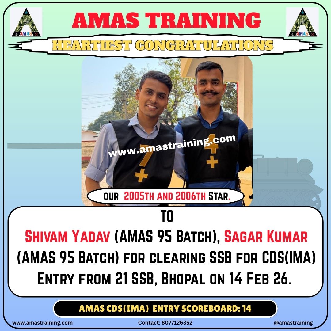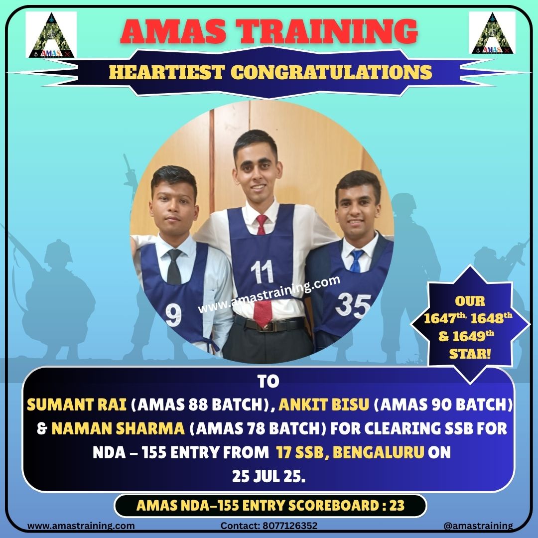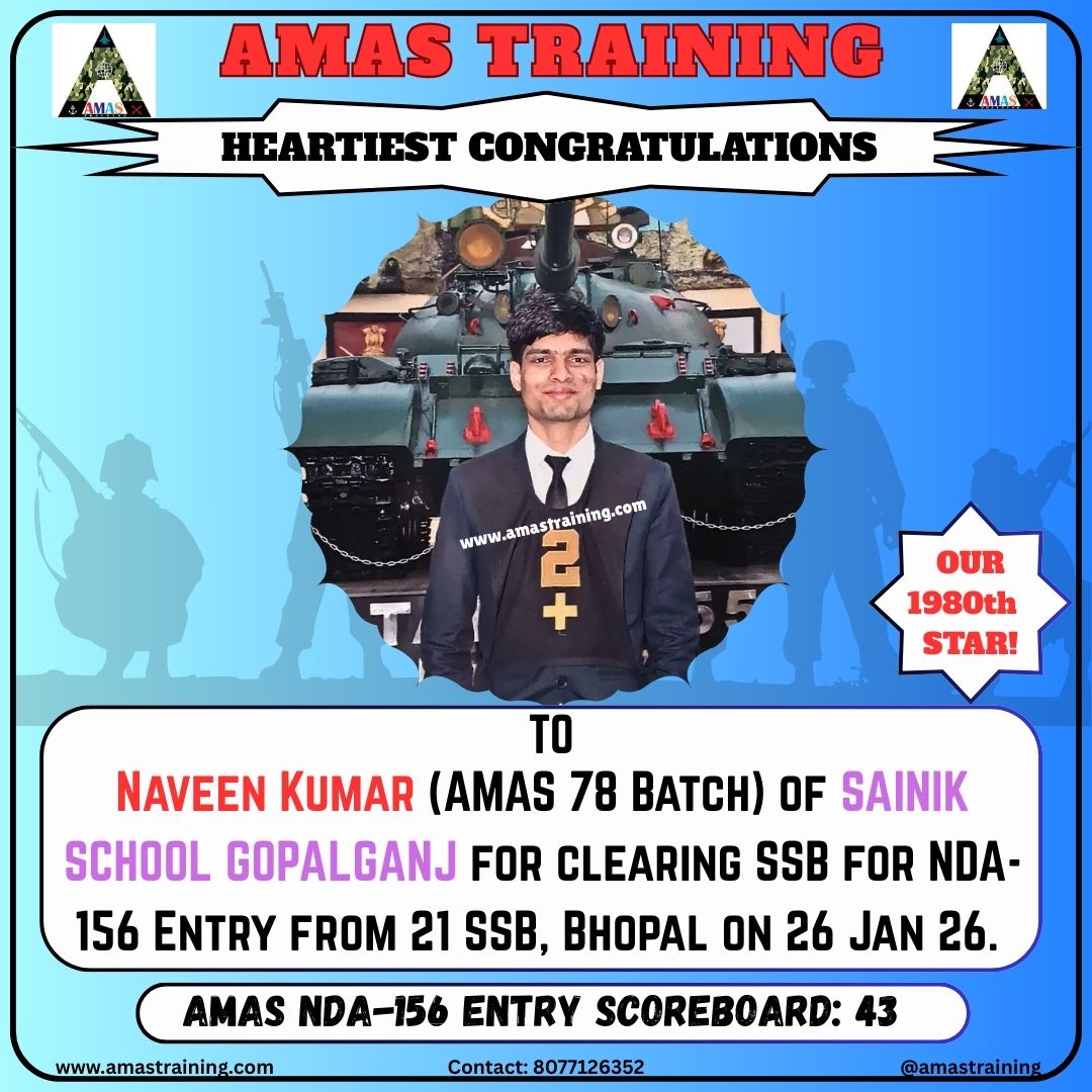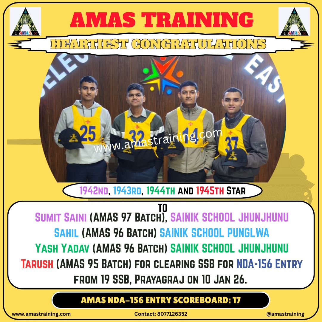 Heartiest Congratulations To: *****SAGAR KUMAR for getting recommended from 21 SSB, BHOPAL on 14 FEB 2026 for CDS(IMA)Entry*****SHIVAM YADAV for getting recommended from 21 SSB, BHOPAL on 14 FEB 2026 for CDS(IMA)Entry*****HIMANSHU for getting recommended from 32 SSB, JALANDHAR on 09 FEB 2026 for TES-55 Entry*****ANKIT KUMAR SINGH for getting recommended from 22 SSB, BHOPAL on 15 FEB 2026 for CDS(IMA)Entry*****APOORVA SAHU for getting recommended from 32 SSB, JALANDHAR on 15 DEC 2025 for SSCW(T) Entry*****SATYAM JHA for getting recommended from 11 SSB, PRAYAGRAJ on 10 JAN 2026 for NDA-156 Entry*****DIVYANSH RANA for getting recommended from 5 AFSB, GUWAHATI on 23 JAN 2026 for NDA-156 Entry*****PRARET SINGH for getting recommended from 17 SSB, BENGALURU on 12 FEB 2026 for CDS(IMA) Entry*****DIP MONDAL for getting recommended from 20 SSB, BHOPAL on 07 FEB 2026 for CDS(IMA) Entry*****ABHIMANYU YADAV for getting recommended from 31 SSB, JALANDHAR on 07 FEB 2026 for CDS(IMA) Entry*****ROHAN for getting recommended from 31 SSB, JALANDHAR on 07 FEB 2026 for CDS(IMA) Entry*****HIMANSHU SHARMA for getting recommended from 1 AFSB, DEHRADUN on 06 FEB 2026 for AFCAT Entry*****ABHISHEK YADAV for getting recommended from 4 AFSB, VARANASI on 07 FEB 2026 for AFCAT Entry*****PREM MAYUR KUMAR of RIMC for getting recommended from NSB, KOLKATA on 10 JAN 2026 for NDA-156 Entry*****KARAN SINGH for getting recommended from 1 AFSB, DEHRADUN on 06 FEB 2026 for AFCAT Entry*****ABHAY THAKUR for getting recommended from 1 AFSB, DEHRADUN on 06 FEB 2026 for AFCAT Entry*****KESHAV SAINI for getting recommended from 1 AFSB, DEHRADUN on 06 FEB 2026 for AFCAT Entry*****ASHUTOSH SHARMA for getting recommended from 22 SSB, BHOPAL on 06 FEB 2026 for CDS(IMA) Entry*****ANURAG SINGH for getting recommended from 20 SSB, BHOPAL on 02 FEB 2026 for CDS(IMA) Entry******PRIYANSHU SINGH for getting recommended from 20 SSB, BHOPAL on 02 FEB 2026 for CDS(IMA) Entry*****RAJAT PORAS for getting recommended from 32 SSB, JALANDHAR on 25 JAN 2026 for NDA-156 Entry*****GURCHETAN SINGH for getting recommended from 4 AFSB, VARANASI on 30 JAN 2026 for NDA-156 Entry*****JIYA GOSWAMI for getting recommended from 22 SSB, BHOPAL on 27 JAN 2026 for NDA-156 Entry*****RIPSI MOHANTY for getting recommended from 24 SSB, BENGALURU on 31 JAN 2026 for NDA-156 Entry*****SHAGUN for getting recommended from 24 SSB, BENGALURU on 31 JAN 2026 for NDA-156 Entry*****ANISHA for getting recommended from 24 SSB, BENGALURU on 31 JAN 2026 for NDA-156 Entry*****NAVEEN KUMAR of SAINIK SCHOOL GOPALGANJ for getting recommended from 21 SSB, BHOPAL on 26 JAN 2026 for NDA-156 Entry*****SAHIL CHIKARA for getting recommended from NSB, VIZAG on 30 JAN 2026 for NAVY (GSX) Entry*****MANISH KUMAR for getting recommended from 32 SSB, JALANDHAR on 30 JAN 2026 for CDS(IMA) Entry*****ABHAY SHARMA for getting recommended from 32 SSB, JALANDHAR on 30 JAN 2026 for CDS(IMA) Entry*****ABHAY SINGH for getting recommended from 18 SSB, PRAYAGRAJ on 29 JAN 2026 for CDS(IMA) Entry*****RITESH PUNDIR for getting recommended from 33 SSB, BHOPAL on 29 JAN 2026 for CDS(INA) Entry*****PRINCE CHAUDHARY for getting recommended from 14 SSB, PRAYAGRAJ on 28 JAN 2026 for CDS(IMA) Entry*****JAYESH PARATE for getting recommended from NSB, VIZAG on 25 JAN 2026 for CDS(INA) Entry*****PRIY RANJAN for getting recommended from 32 SSB, JALANDHAR on 25 JAN 2026 for NDA-156 Entry*****ABHINAV SINGH for getting recommended from 4 AFSB, VARANASI on 23 JAN 2026 for NDA-156 Entry*****EKNOOR SINGH for getting recommended from 4 AFSB, VARANASI on 23 JAN 2026 for NDA-156 Entry*****SIDHARTH MANHOTRA for getting recommended from 4 AFSB, VARANASI on 23 JAN 2026 for NDA-156 Entry*****Cdt AADI RANE for getting recommended from 4 AFSB, VARANASI on 23 JAN 2026 for NDA-156 Entry*****ARYAN SINGH for getting recommended from NSB, KOLKATA on 24 JAN 2026 for Navy Tech Entry*****RAVISH KHAN for getting recommended from 21 SSB, BHOPAL on 24 JAN 2026 for NDA-156 Entry*****MUNNA GUPTA of SAINIK SCHOOL GOPALGANJ for getting recommended from 33 SSB, BHOPAL on 19 JAN 2026 for NDA-156 Entry*****ARMAANDEEP SINGH of NSPI for getting recommended from 21 SSB, BHOPAL on 19 JAN 2026 for NDA-156 Entry*****AKSHAT CHRIS BERG for getting recommended from 18 SSB, PRAYAGRAJ on 19 JAN 2026 for NDA-156 Entry*****PUSHMINDER SINGH for getting recommended from 18 SSB, PRAYAGRAJ on 19 JAN 2026 for NDA-156 Entry*****MAYANK CHAUDHARI for getting recommended from 3 AFSB, GANDHINAGAR on 16 JAN 2025 for NDA-156 Entry*****HARKIRAT SINGH for getting recommended from 22 SSB, BHOPAL on 17 JAN 2025 for NDA-156 Entry*****NAWABPREET SINGH for getting recommended from 1 AFSB, DEHRADUN on 16 JAN 2025 for NDA-156 Entry*****SANYAM BALIYAN for getting recommended from 5 AFSB, GUWAHATI on 16 JAN 2025 for NDA-156 Entry*****AYUSHMAN SINGH for getting recommended from 34 SSB, PRAYAGRAJ on 16 JAN 2025 for NDA-156 Entry*****ABHAY PRATAP SINGH for getting recommended from 32 SSB, JALANDHAR on 15 JAN 2025 for NDA-156 Entry*****GURTEJ SINGH DUTTA for getting recommended from 19 SSB, PRAYAGRAJ on 15 JAN 2025 for NDA-156 Entry*****SAKSHI SRIVASTAVA for getting recommended from 11 SSB, PRAYAGRAJ on 7 JAN 2025 for JAG Entry*****KARISHMA DODAIN for getting recommended from 20 SSB, BHOPAL on 6 JAN 2025 for JAG Entry*****TILAK PAREEK for getting recommended from 32 SSB, JALANDHAR on 5 JAN 2025 for NCC Entry*****JAYA MISHRA for getting recommended from 33 SSB, BHOPAL on 4 JAN 2025 for SSC(NAIC) Entry*****SHRIKANT SINGH for getting recommended from 31 SSB, JALANDHAR on 2 JAN 2025 for NCC Entry*****ELIZABETH MOHAN for getting recommended from 20 SSB, BHOPAL on 3 JAN 2025 for NCC Entry*****KULDEEP CHOUDHARY for getting recommended from 3 AFSB, GANDHINAGAR on 2 JAN 2025 for NDA-156 Entry*****AYUSH SAINI for getting recommended from 2 AFSB, MYSORE on 2 JAN 2025 for NDA-156 Entry*****PRINCE CHAUDHARY for getting recommended from 22 SSB, BHOPAL on 1 JAN 2025 for NCC Entry*****KESHAV NARAYAN AWASTHI fo