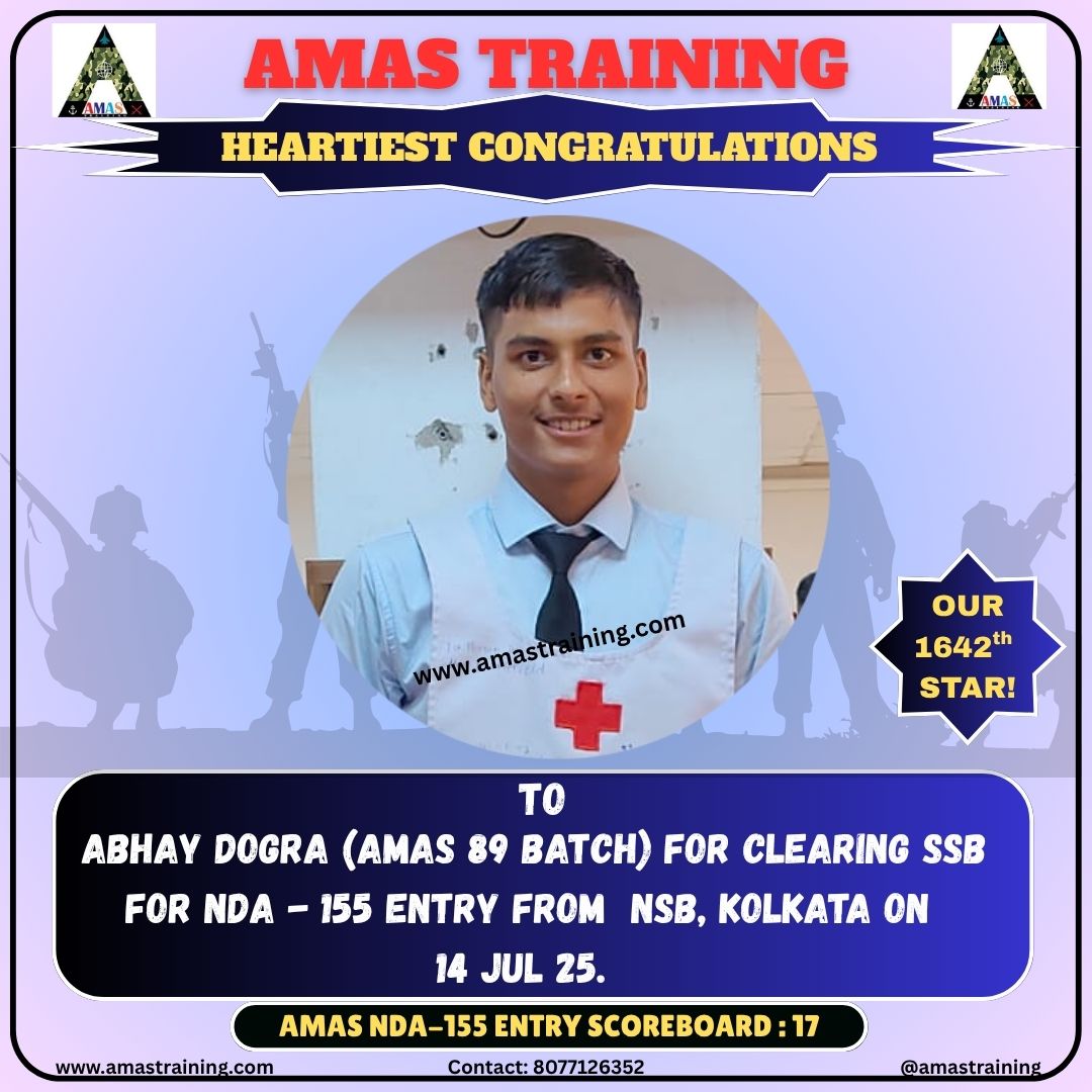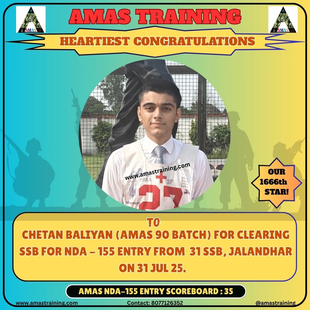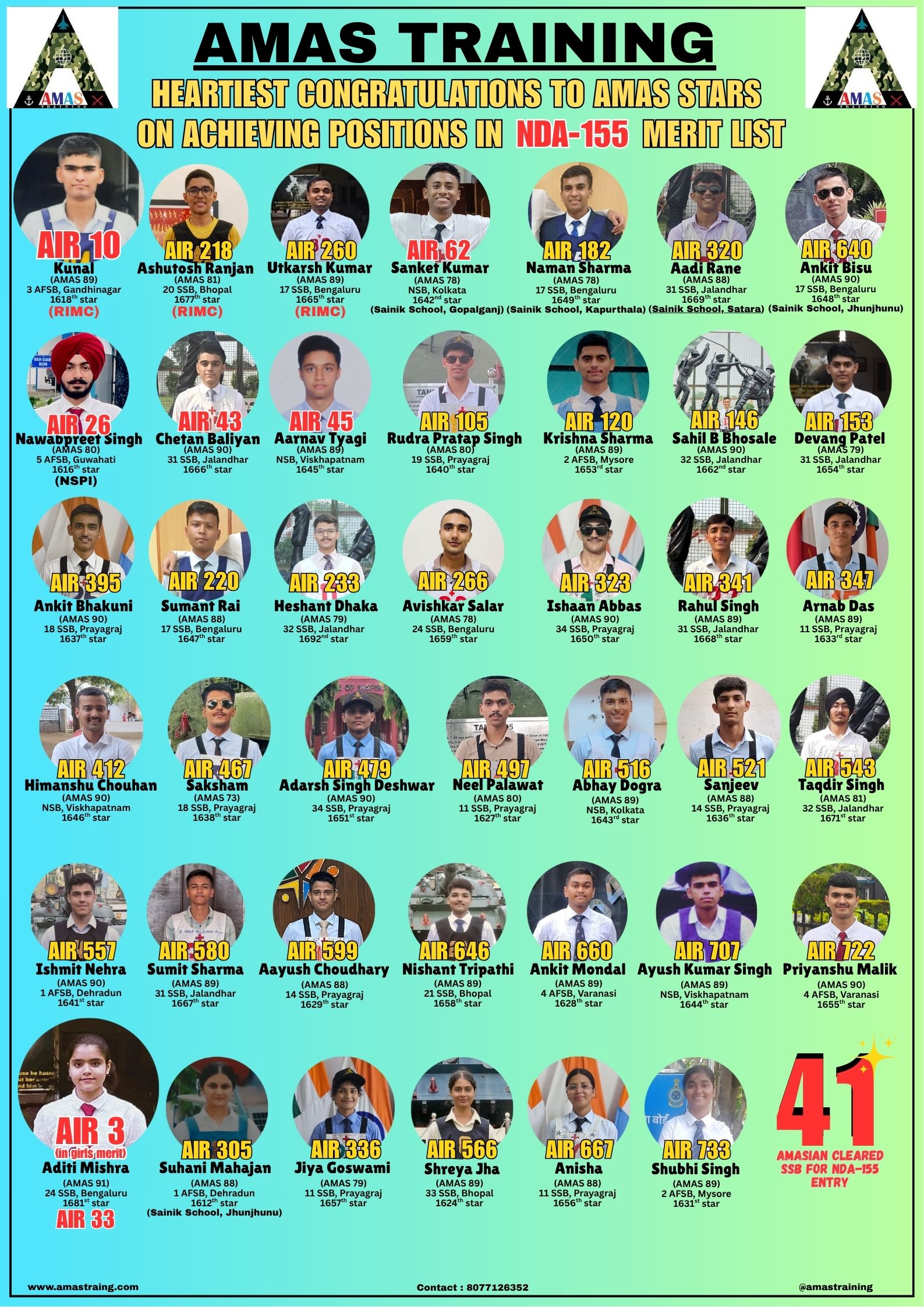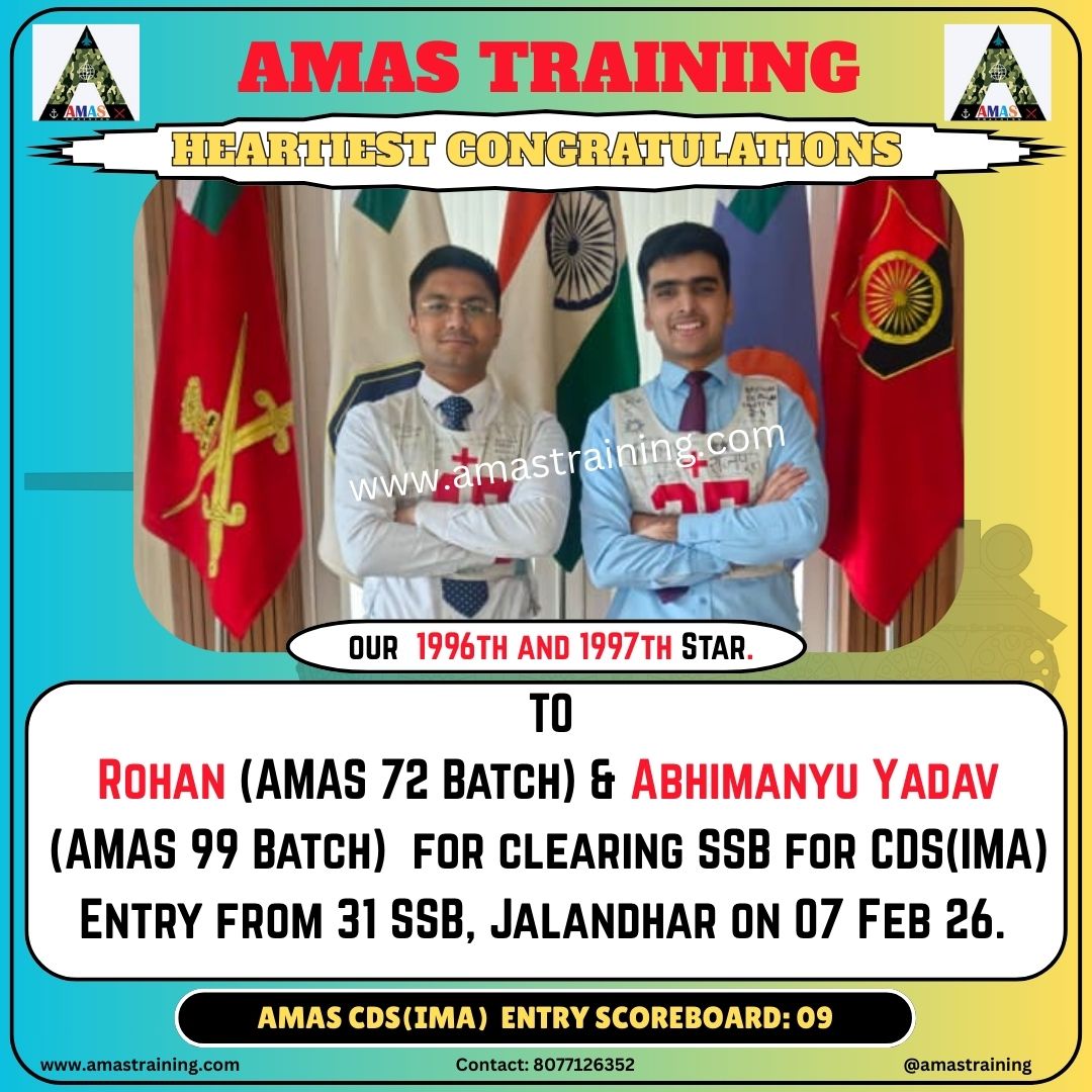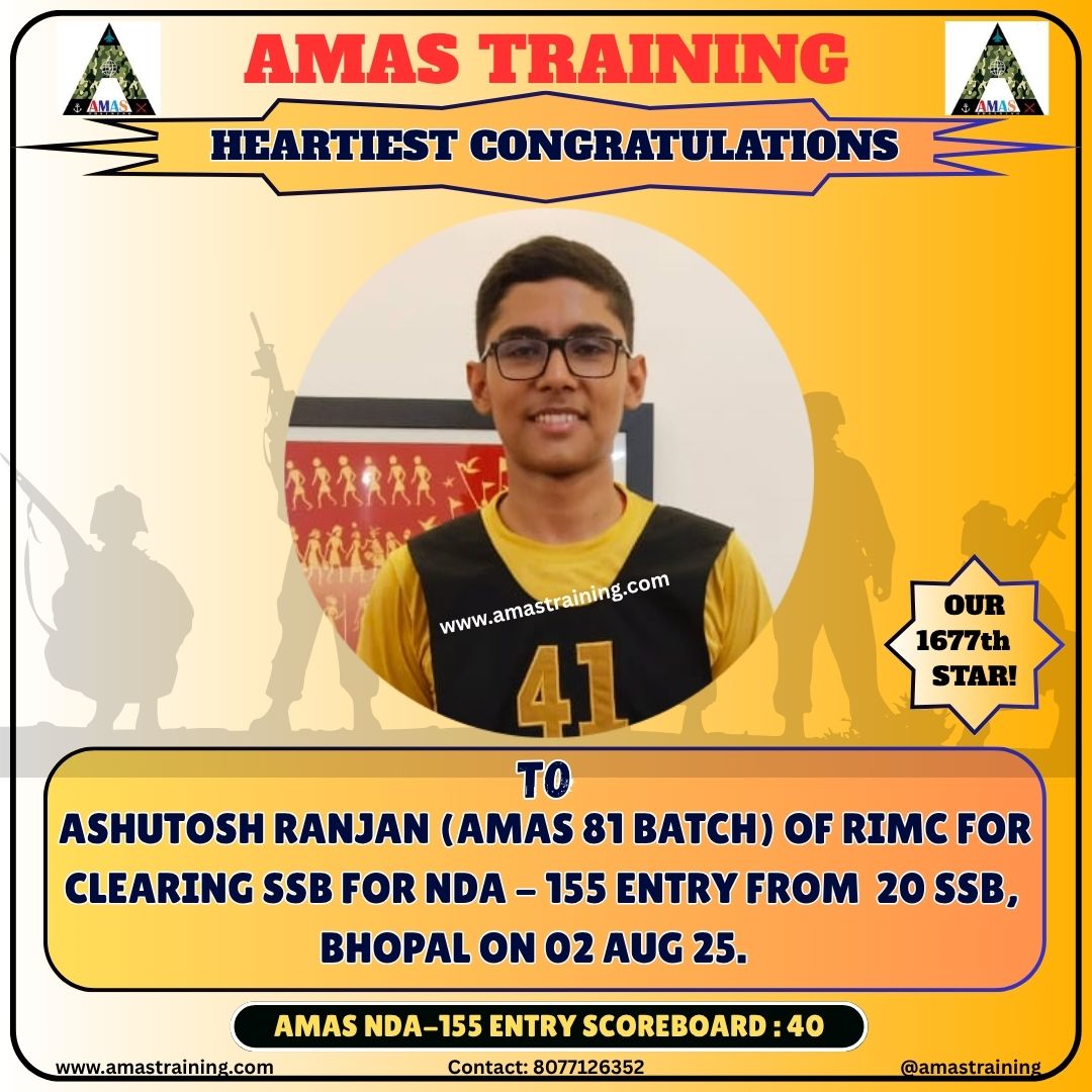 Heartiest Congratulations To: *****SAGAR KUMAR for getting recommended from 21 SSB, BHOPAL on 14 FEB 2026 for CDS(IMA)Entry*****SHIVAM YADAV for getting recommended from 21 SSB, BHOPAL on 14 FEB 2026 for CDS(IMA)Entry*****HIMANSHU for getting recommended from 32 SSB, JALANDHAR on 09 FEB 2026 for TES-55 Entry*****ANKIT KUMAR SINGH for getting recommended from 22 SSB, BHOPAL on 15 FEB 2026 for CDS(IMA)Entry*****APOORVA SAHU for getting recommended from 32 SSB, JALANDHAR on 15 DEC 2025 for SSCW(T) Entry*****SATYAM JHA for getting recommended from 11 SSB, PRAYAGRAJ on 10 JAN 2026 for NDA-156 Entry*****DIVYANSH RANA for getting recommended from 5 AFSB, GUWAHATI on 23 JAN 2026 for NDA-156 Entry*****PRARET SINGH for getting recommended from 17 SSB, BENGALURU on 12 FEB 2026 for CDS(IMA) Entry*****DIP MONDAL for getting recommended from 20 SSB, BHOPAL on 07 FEB 2026 for CDS(IMA) Entry*****ABHIMANYU YADAV for getting recommended from 31 SSB, JALANDHAR on 07 FEB 2026 for CDS(IMA) Entry*****ROHAN for getting recommended from 31 SSB, JALANDHAR on 07 FEB 2026 for CDS(IMA) Entry*****HIMANSHU SHARMA for getting recommended from 1 AFSB, DEHRADUN on 06 FEB 2026 for AFCAT Entry*****ABHISHEK YADAV for getting recommended from 4 AFSB, VARANASI on 07 FEB 2026 for AFCAT Entry*****PREM MAYUR KUMAR of RIMC for getting recommended from NSB, KOLKATA on 10 JAN 2026 for NDA-156 Entry*****KARAN SINGH for getting recommended from 1 AFSB, DEHRADUN on 06 FEB 2026 for AFCAT Entry*****ABHAY THAKUR for getting recommended from 1 AFSB, DEHRADUN on 06 FEB 2026 for AFCAT Entry*****KESHAV SAINI for getting recommended from 1 AFSB, DEHRADUN on 06 FEB 2026 for AFCAT Entry*****ASHUTOSH SHARMA for getting recommended from 22 SSB, BHOPAL on 06 FEB 2026 for CDS(IMA) Entry*****ANURAG SINGH for getting recommended from 20 SSB, BHOPAL on 02 FEB 2026 for CDS(IMA) Entry******PRIYANSHU SINGH for getting recommended from 20 SSB, BHOPAL on 02 FEB 2026 for CDS(IMA) Entry*****RAJAT PORAS for getting recommended from 32 SSB, JALANDHAR on 25 JAN 2026 for NDA-156 Entry*****GURCHETAN SINGH for getting recommended from 4 AFSB, VARANASI on 30 JAN 2026 for NDA-156 Entry*****JIYA GOSWAMI for getting recommended from 22 SSB, BHOPAL on 27 JAN 2026 for NDA-156 Entry*****RIPSI MOHANTY for getting recommended from 24 SSB, BENGALURU on 31 JAN 2026 for NDA-156 Entry*****SHAGUN for getting recommended from 24 SSB, BENGALURU on 31 JAN 2026 for NDA-156 Entry*****ANISHA for getting recommended from 24 SSB, BENGALURU on 31 JAN 2026 for NDA-156 Entry*****NAVEEN KUMAR of SAINIK SCHOOL GOPALGANJ for getting recommended from 21 SSB, BHOPAL on 26 JAN 2026 for NDA-156 Entry*****SAHIL CHIKARA for getting recommended from NSB, VIZAG on 30 JAN 2026 for NAVY (GSX) Entry*****MANISH KUMAR for getting recommended from 32 SSB, JALANDHAR on 30 JAN 2026 for CDS(IMA) Entry*****ABHAY SHARMA for getting recommended from 32 SSB, JALANDHAR on 30 JAN 2026 for CDS(IMA) Entry*****ABHAY SINGH for getting recommended from 18 SSB, PRAYAGRAJ on 29 JAN 2026 for CDS(IMA) Entry*****RITESH PUNDIR for getting recommended from 33 SSB, BHOPAL on 29 JAN 2026 for CDS(INA) Entry*****PRINCE CHAUDHARY for getting recommended from 14 SSB, PRAYAGRAJ on 28 JAN 2026 for CDS(IMA) Entry*****JAYESH PARATE for getting recommended from NSB, VIZAG on 25 JAN 2026 for CDS(INA) Entry*****PRIY RANJAN for getting recommended from 32 SSB, JALANDHAR on 25 JAN 2026 for NDA-156 Entry*****ABHINAV SINGH for getting recommended from 4 AFSB, VARANASI on 23 JAN 2026 for NDA-156 Entry*****EKNOOR SINGH for getting recommended from 4 AFSB, VARANASI on 23 JAN 2026 for NDA-156 Entry*****SIDHARTH MANHOTRA for getting recommended from 4 AFSB, VARANASI on 23 JAN 2026 for NDA-156 Entry*****Cdt AADI RANE for getting recommended from 4 AFSB, VARANASI on 23 JAN 2026 for NDA-156 Entry*****ARYAN SINGH for getting recommended from NSB, KOLKATA on 24 JAN 2026 for Navy Tech Entry*****RAVISH KHAN for getting recommended from 21 SSB, BHOPAL on 24 JAN 2026 for NDA-156 Entry*****MUNNA GUPTA of SAINIK SCHOOL GOPALGANJ for getting recommended from 33 SSB, BHOPAL on 19 JAN 2026 for NDA-156 Entry*****ARMAANDEEP SINGH of NSPI for getting recommended from 21 SSB, BHOPAL on 19 JAN 2026 for NDA-156 Entry*****AKSHAT CHRIS BERG for getting recommended from 18 SSB, PRAYAGRAJ on 19 JAN 2026 for NDA-156 Entry*****PUSHMINDER SINGH for getting recommended from 18 SSB, PRAYAGRAJ on 19 JAN 2026 for NDA-156 Entry*****MAYANK CHAUDHARI for getting recommended from 3 AFSB, GANDHINAGAR on 16 JAN 2025 for NDA-156 Entry*****HARKIRAT SINGH for getting recommended from 22 SSB, BHOPAL on 17 JAN 2025 for NDA-156 Entry*****NAWABPREET SINGH for getting recommended from 1 AFSB, DEHRADUN on 16 JAN 2025 for NDA-156 Entry*****SANYAM BALIYAN for getting recommended from 5 AFSB, GUWAHATI on 16 JAN 2025 for NDA-156 Entry*****AYUSHMAN SINGH for getting recommended from 34 SSB, PRAYAGRAJ on 16 JAN 2025 for NDA-156 Entry*****ABHAY PRATAP SINGH for getting recommended from 32 SSB, JALANDHAR on 15 JAN 2025 for NDA-156 Entry*****GURTEJ SINGH DUTTA for getting recommended from 19 SSB, PRAYAGRAJ on 15 JAN 2025 for NDA-156 Entry*****SAKSHI SRIVASTAVA for getting recommended from 11 SSB, PRAYAGRAJ on 7 JAN 2025 for JAG Entry*****KARISHMA DODAIN for getting recommended from 20 SSB, BHOPAL on 6 JAN 2025 for JAG Entry*****TILAK PAREEK for getting recommended from 32 SSB, JALANDHAR on 5 JAN 2025 for NCC Entry*****JAYA MISHRA for getting recommended from 33 SSB, BHOPAL on 4 JAN 2025 for SSC(NAIC) Entry*****SHRIKANT SINGH for getting recommended from 31 SSB, JALANDHAR on 2 JAN 2025 for NCC Entry*****ELIZABETH MOHAN for getting recommended from 20 SSB, BHOPAL on 3 JAN 2025 for NCC Entry*****KULDEEP CHOUDHARY for getting recommended from 3 AFSB, GANDHINAGAR on 2 JAN 2025 for NDA-156 Entry*****AYUSH SAINI for getting recommended from 2 AFSB, MYSORE on 2 JAN 2025 for NDA-156 Entry*****PRINCE CHAUDHARY for getting recommended from 22 SSB, BHOPAL on 1 JAN 2025 for NCC Entry*****KESHAV NARAYAN AWASTHI fo