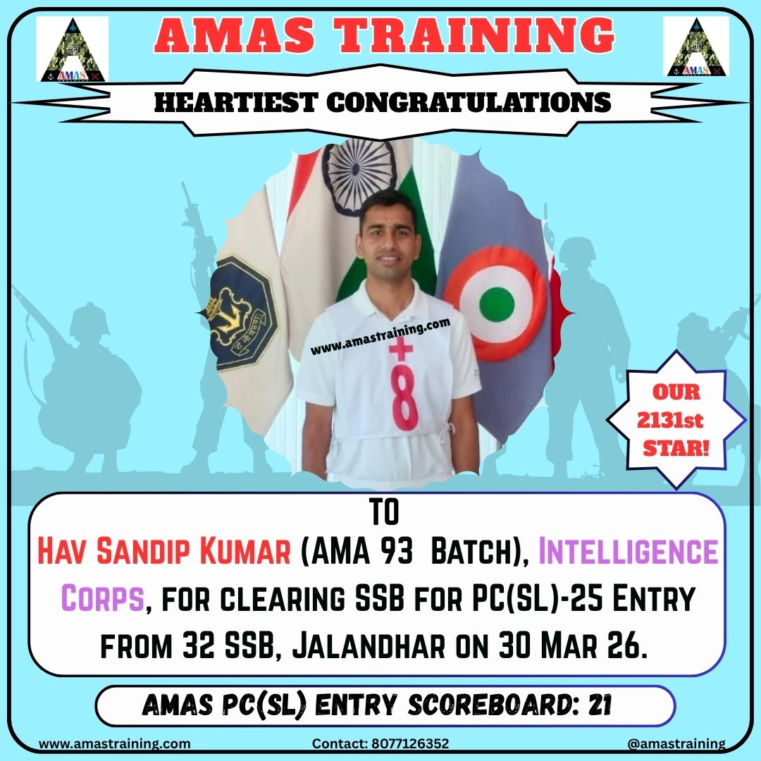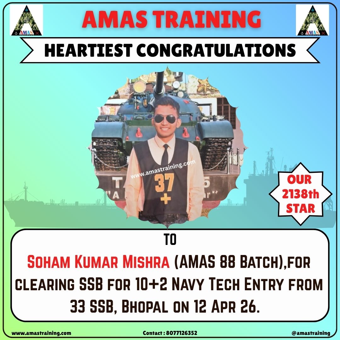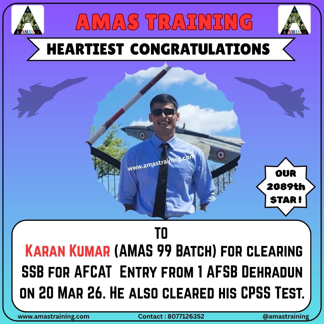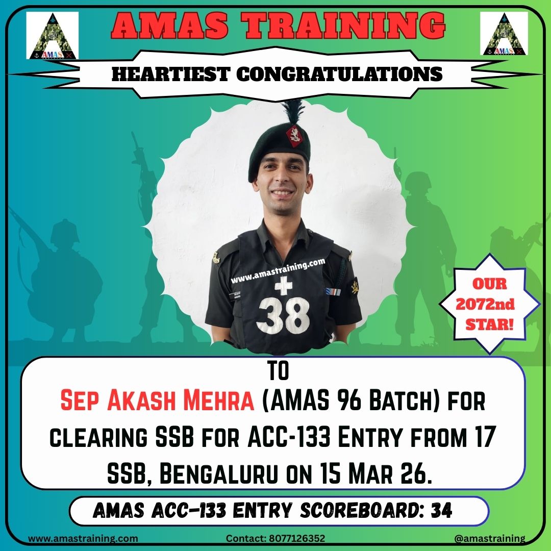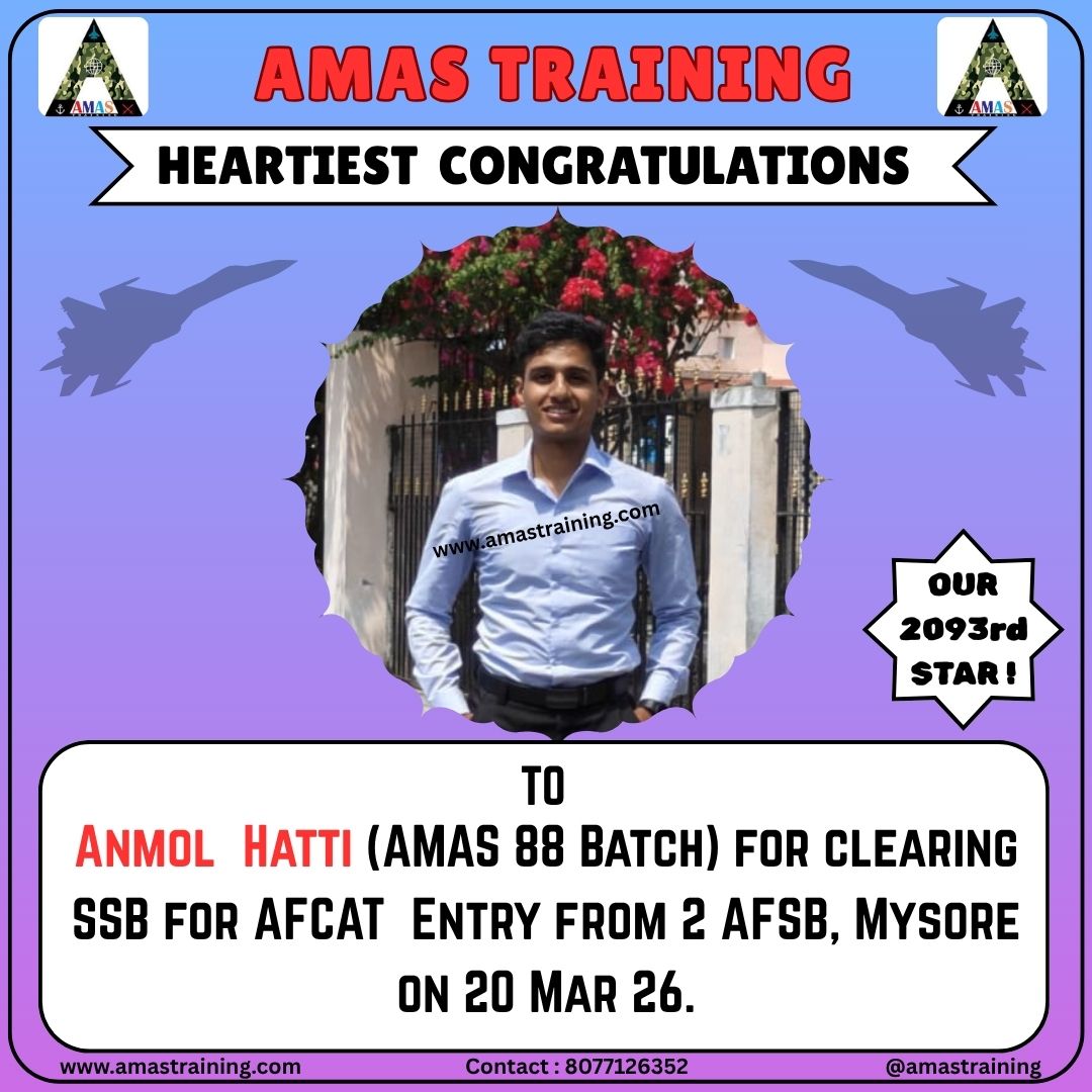 “Its really PROUD to be a part of such great ACADEMY...!! The classes are superb with all the required facilities and so COOPERATING faculty. You can even share any kind of problem with the main AUTHORITIES. All over the academv team in very INSPIRING and full of ENTHUSIASM..The most admiring part is that the tutors focus on CONCEPTUAL development..!! So I recommend students aspiring for SSB to join ”AMAS TRAINING, THE GURUKUL OF SSB" for enhancing your knowledge and to get best RESULTS..!!