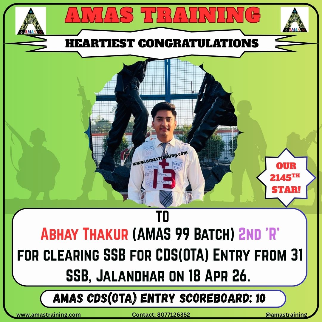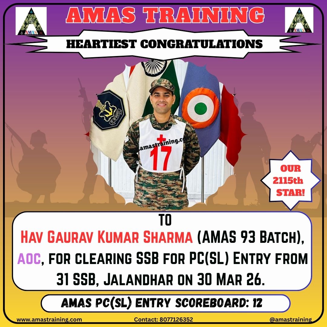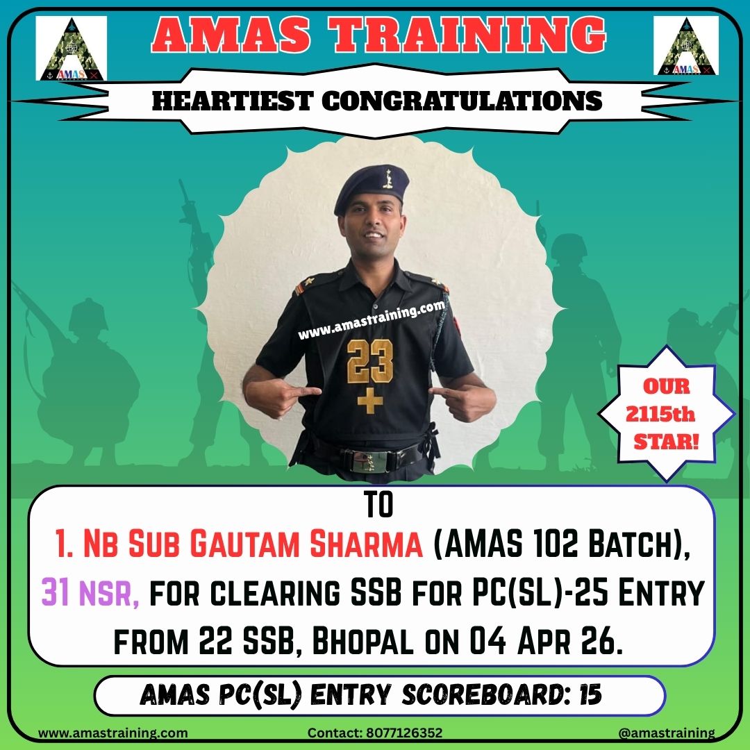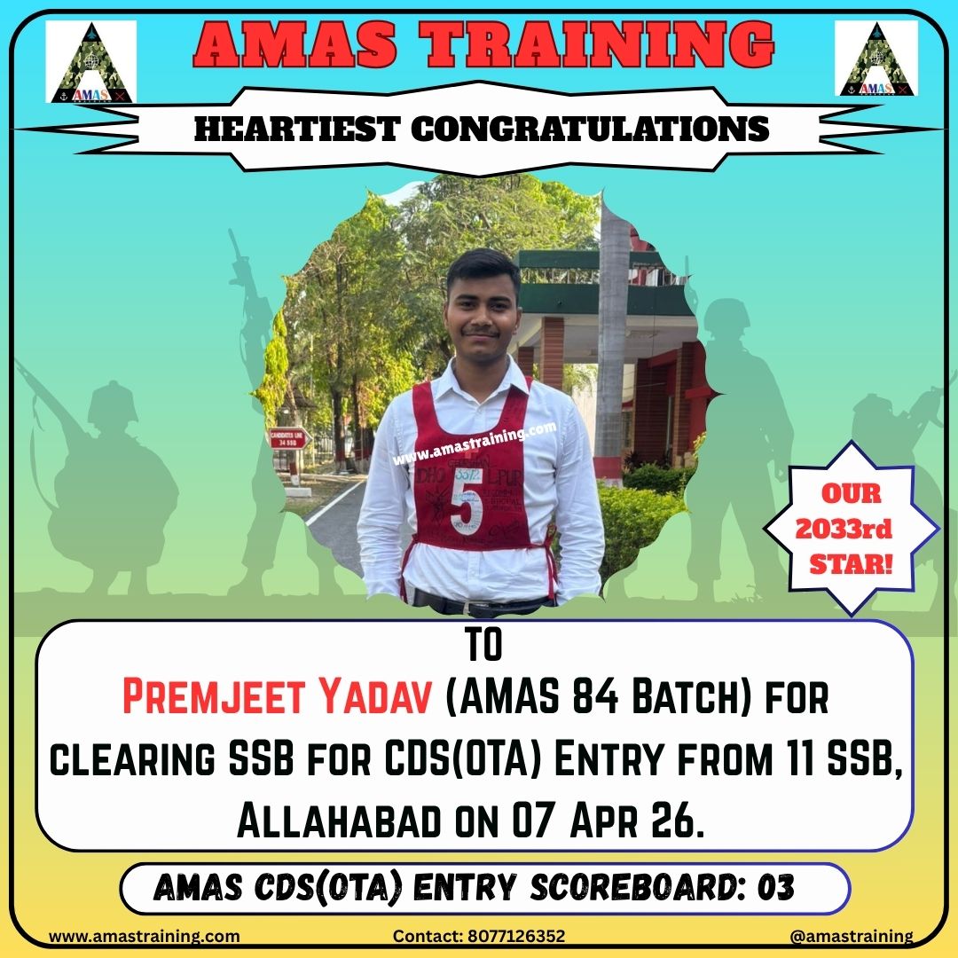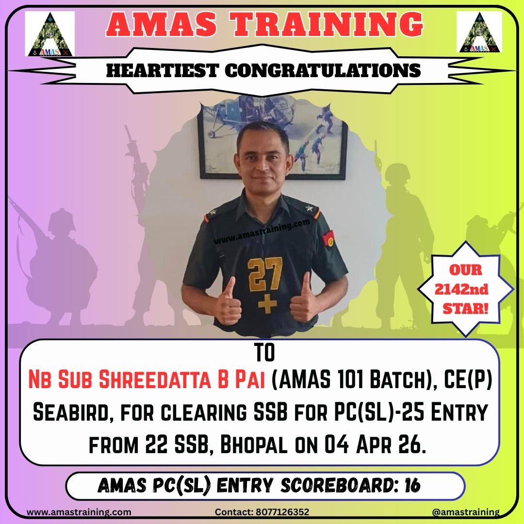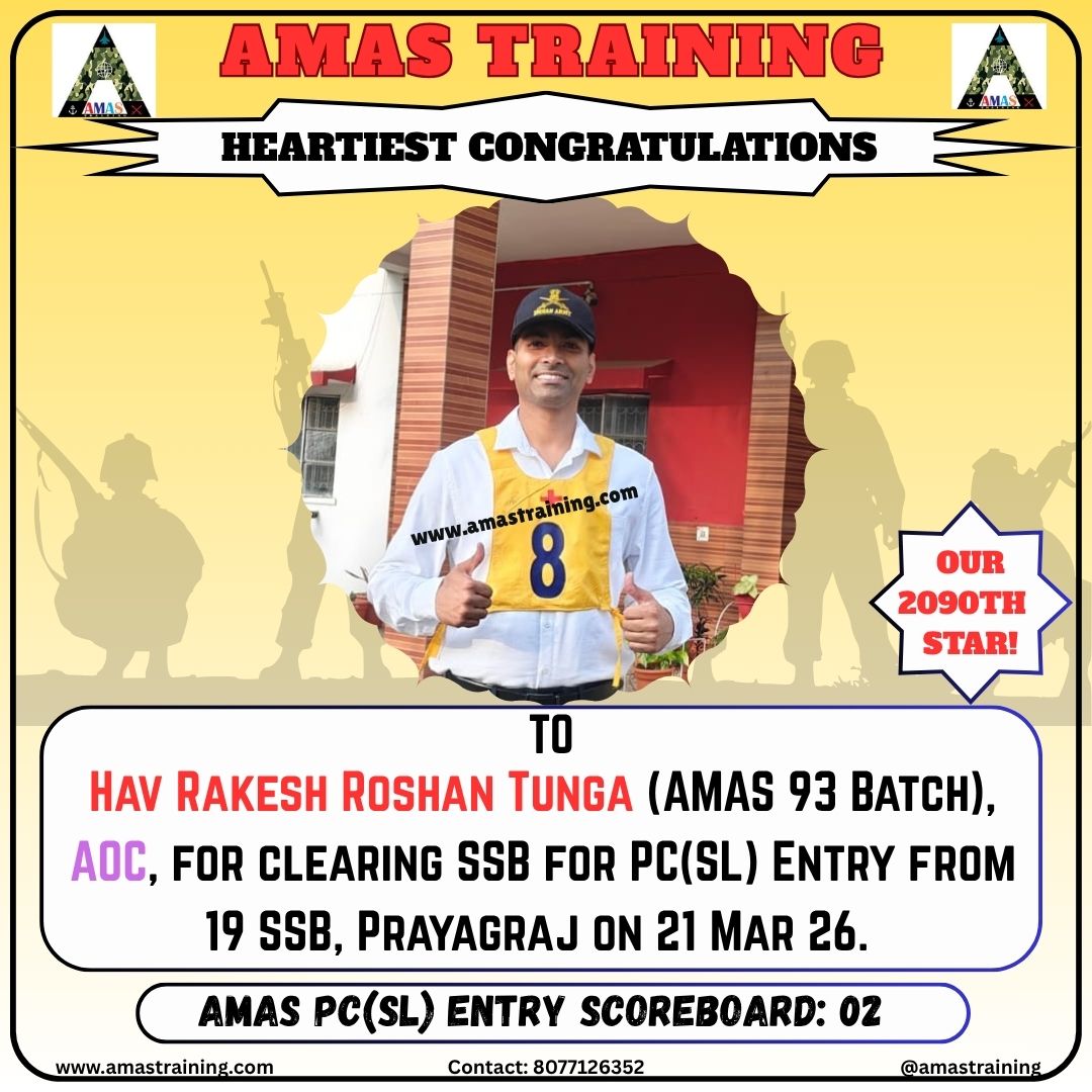 “Its really PROUD to be a part of such great ACADEMY...!! The classes are superb with all the required facilities and so COOPERATING faculty. You can even share any kind of problem with the main AUTHORITIES. All over the academv team in very INSPIRING and full of ENTHUSIASM..The most admiring part is that the tutors focus on CONCEPTUAL development..!! So I recommend students aspiring for SSB to join ”AMAS TRAINING, THE GURUKUL OF SSB" for enhancing your knowledge and to get best RESULTS..!!