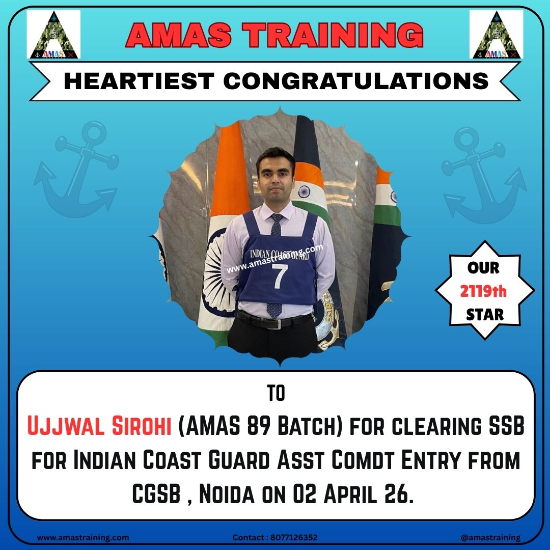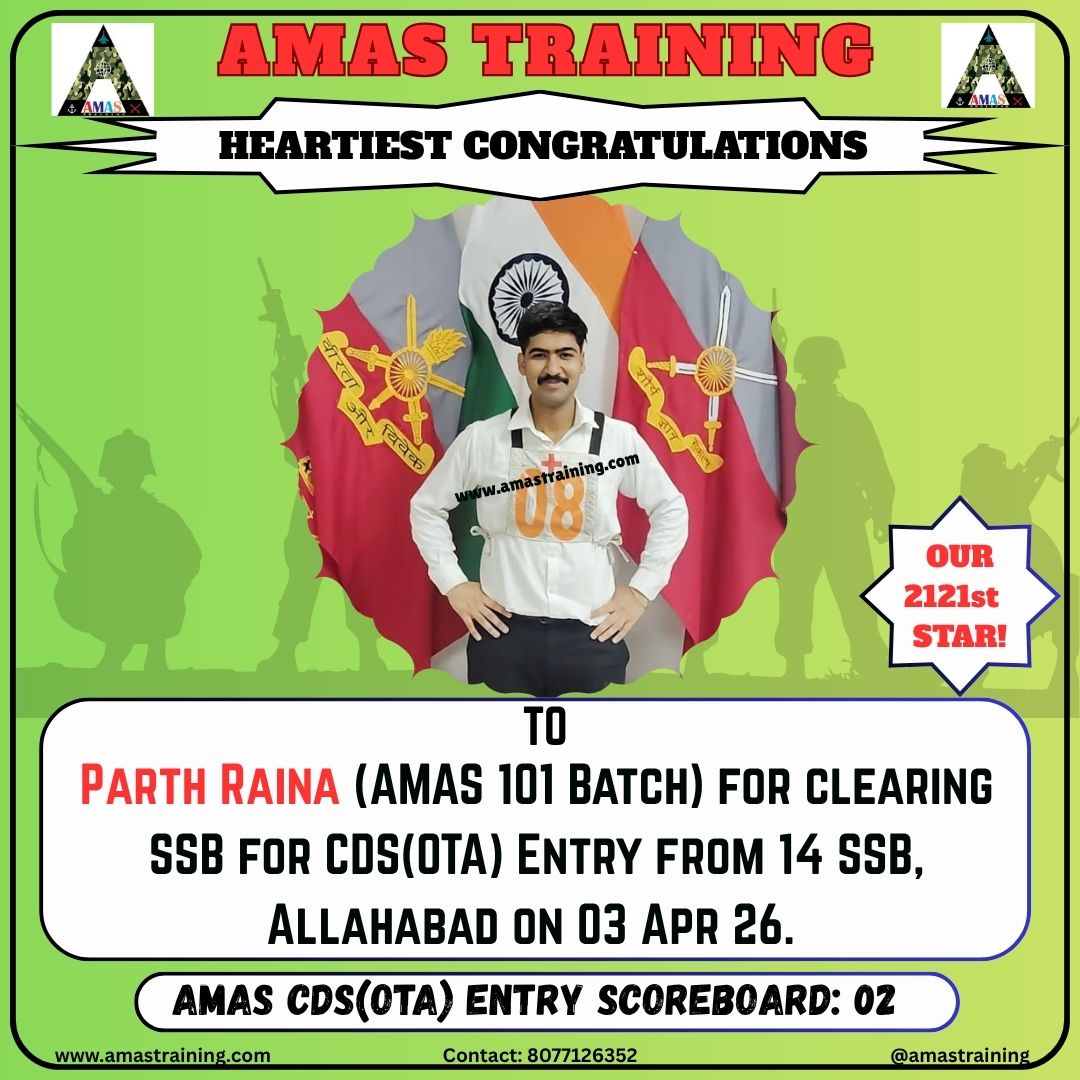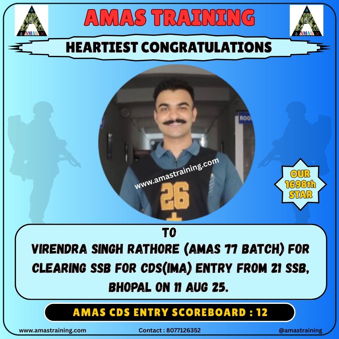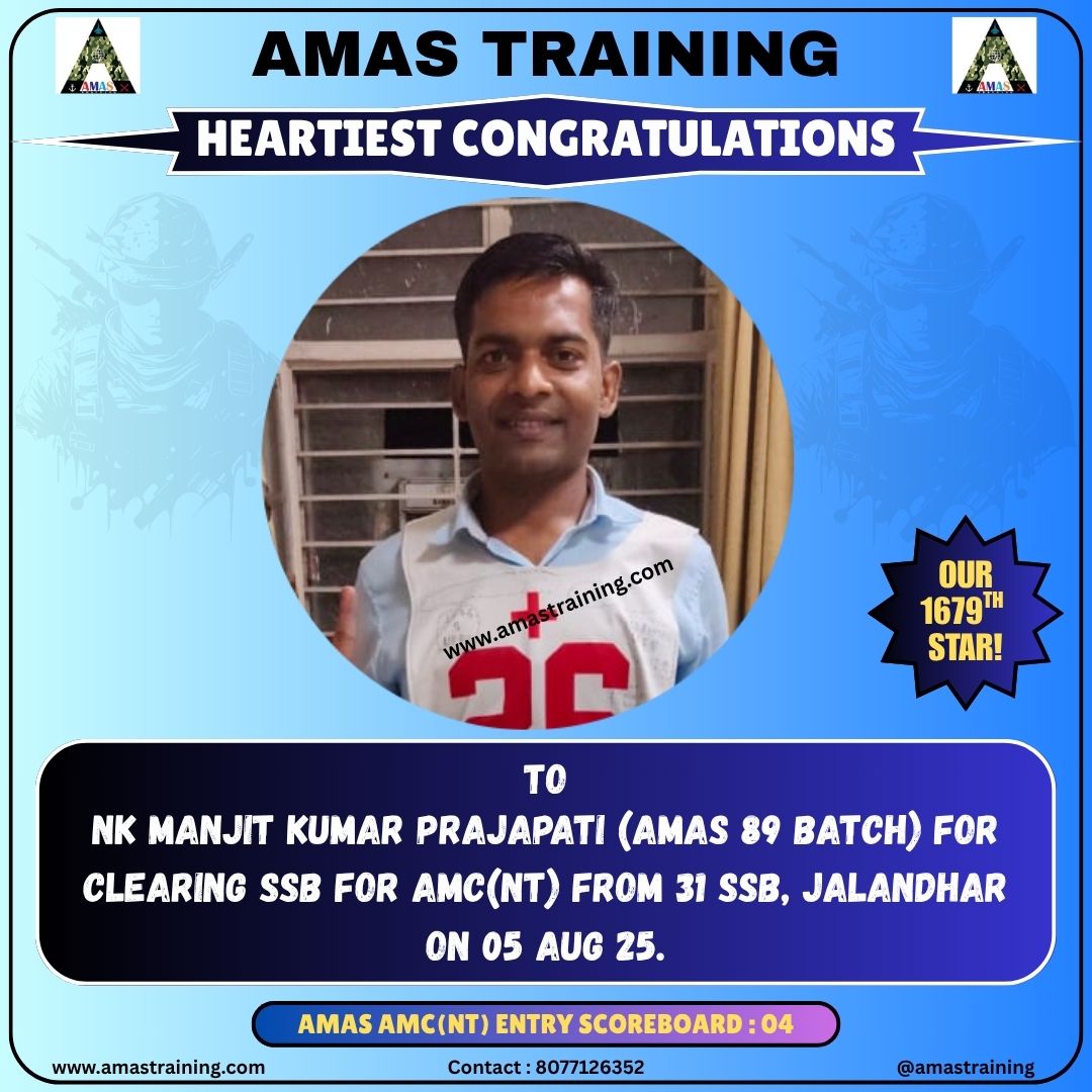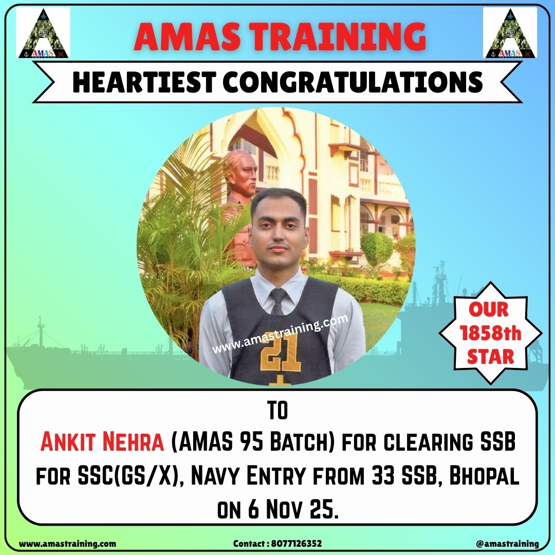 “Its really PROUD to be a part of such great ACADEMY...!! The classes are superb with all the required facilities and so COOPERATING faculty. You can even share any kind of problem with the main AUTHORITIES. All over the academv team in very INSPIRING and full of ENTHUSIASM..The most admiring part is that the tutors focus on CONCEPTUAL development..!! So I recommend students aspiring for SSB to join ”AMAS TRAINING, THE GURUKUL OF SSB" for enhancing your knowledge and to get best RESULTS..!!