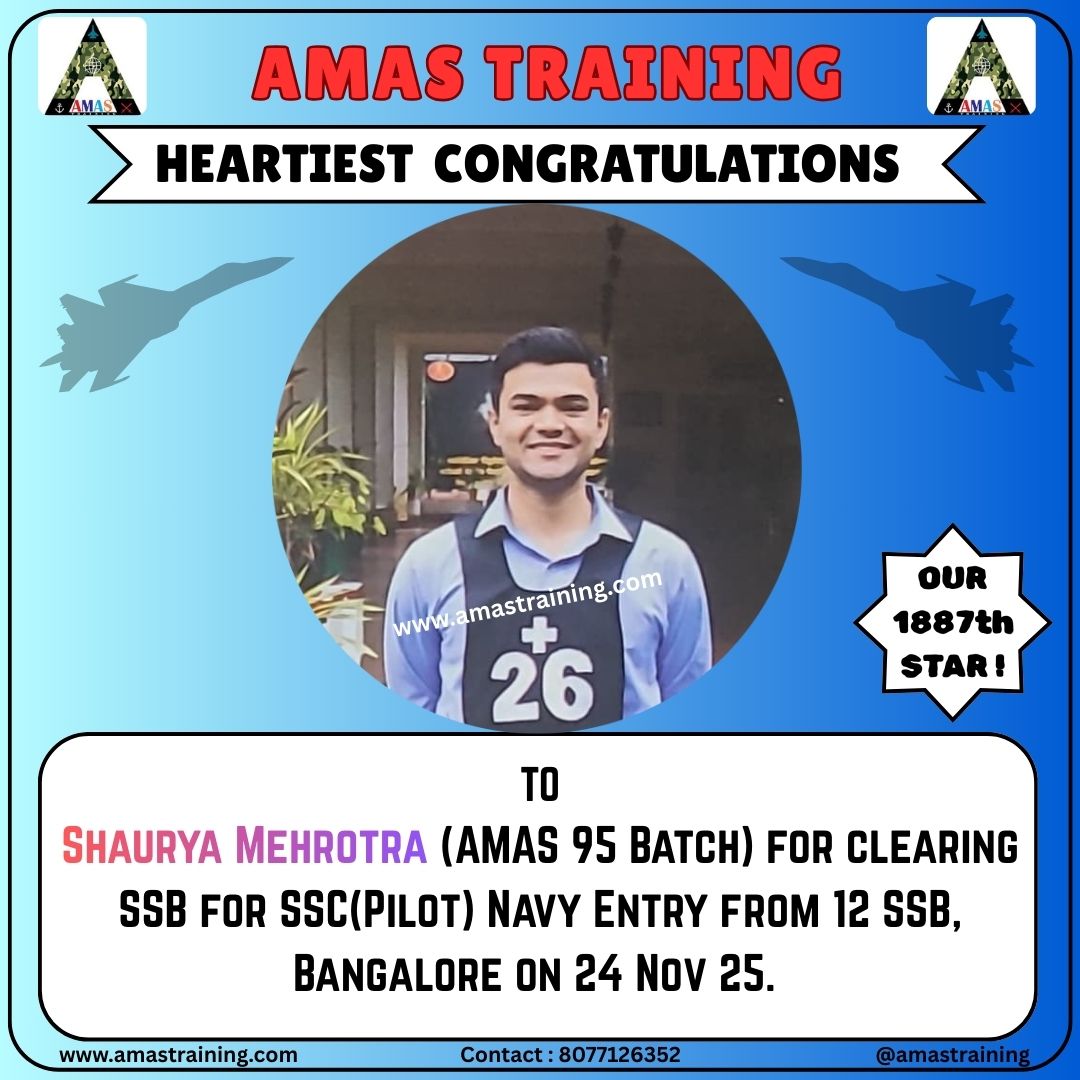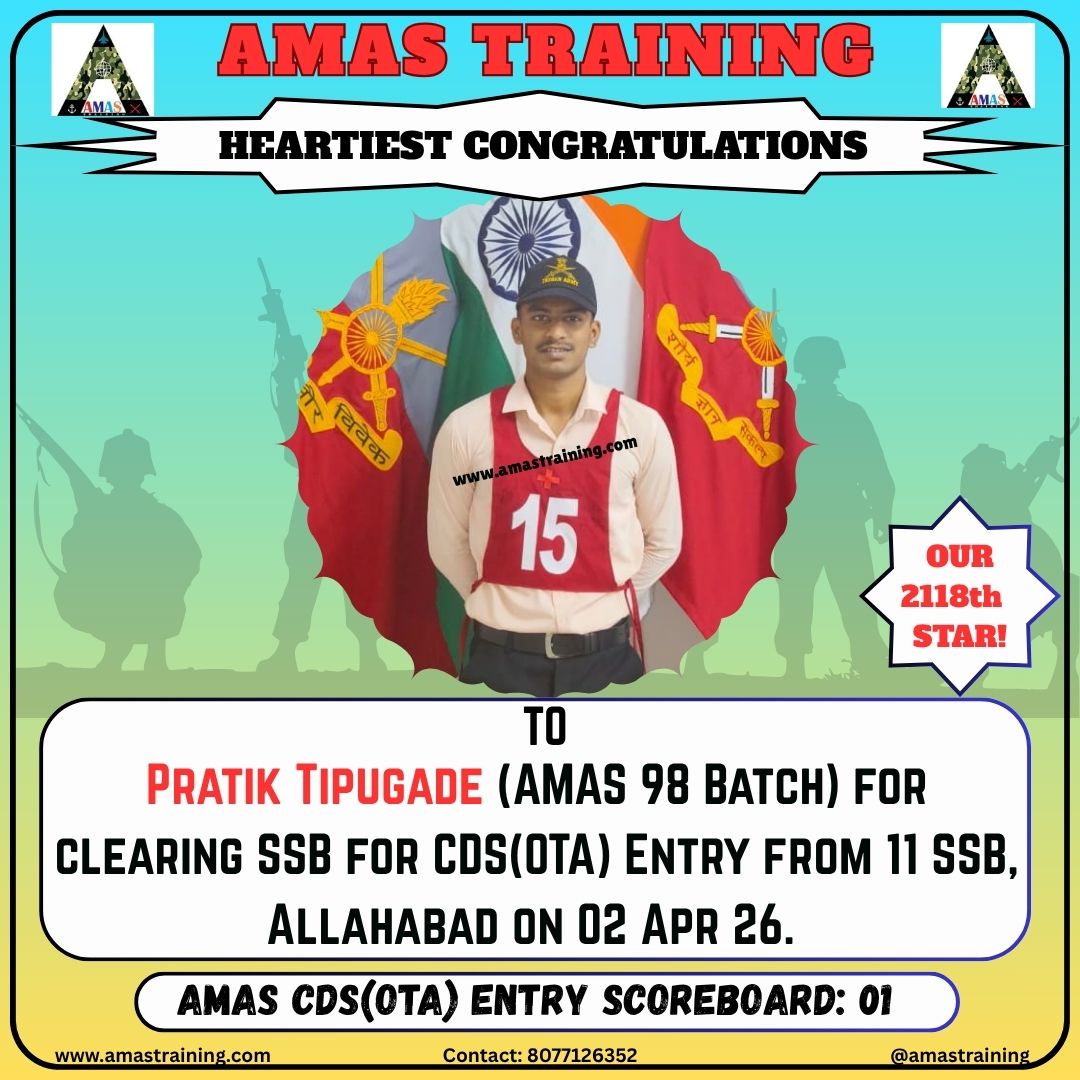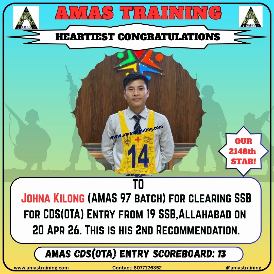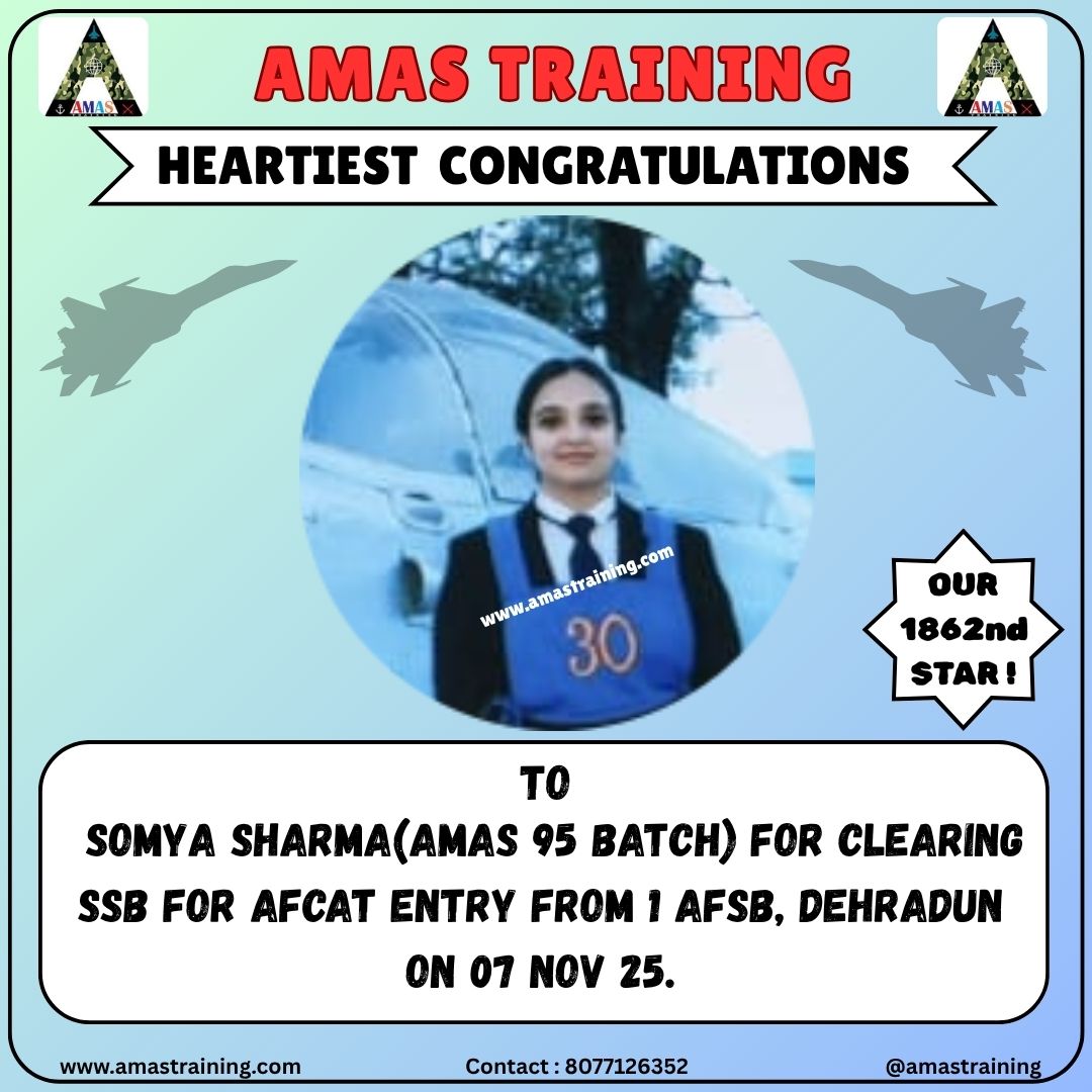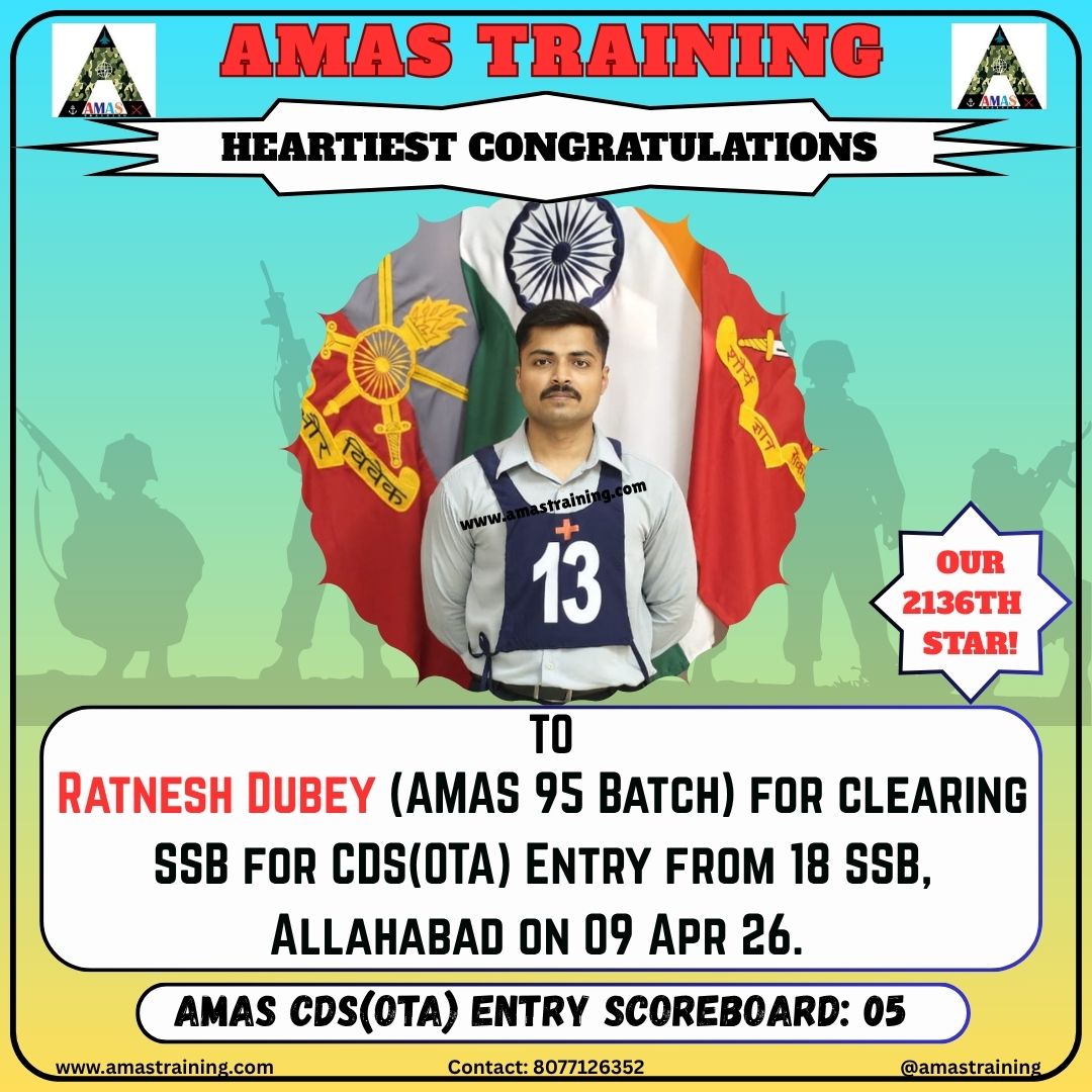 “Its really PROUD to be a part of such great ACADEMY...!! The classes are superb with all the required facilities and so COOPERATING faculty. You can even share any kind of problem with the main AUTHORITIES. All over the academv team in very INSPIRING and full of ENTHUSIASM..The most admiring part is that the tutors focus on CONCEPTUAL development..!! So I recommend students aspiring for SSB to join ”AMAS TRAINING, THE GURUKUL OF SSB" for enhancing your knowledge and to get best RESULTS..!!