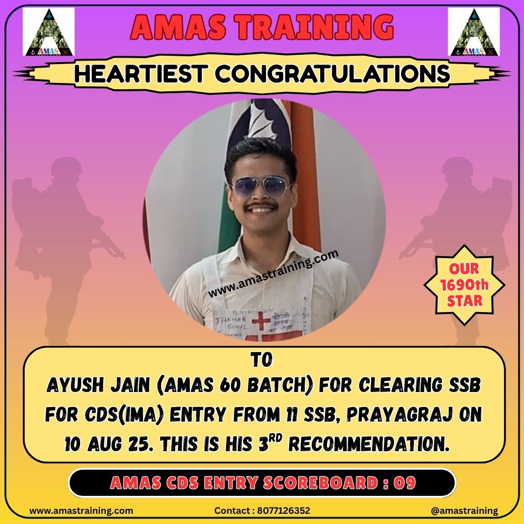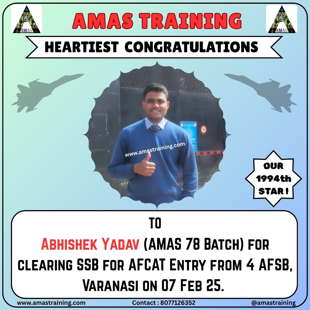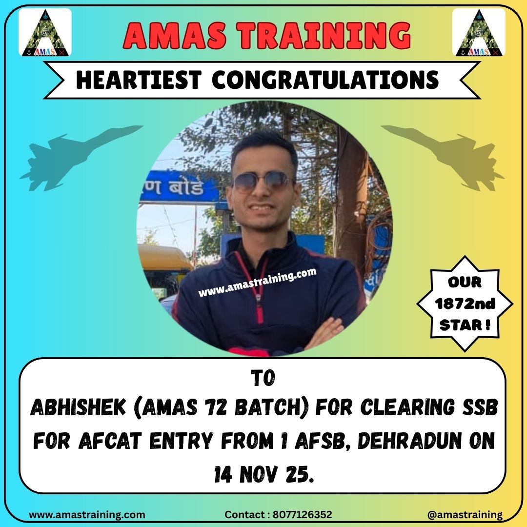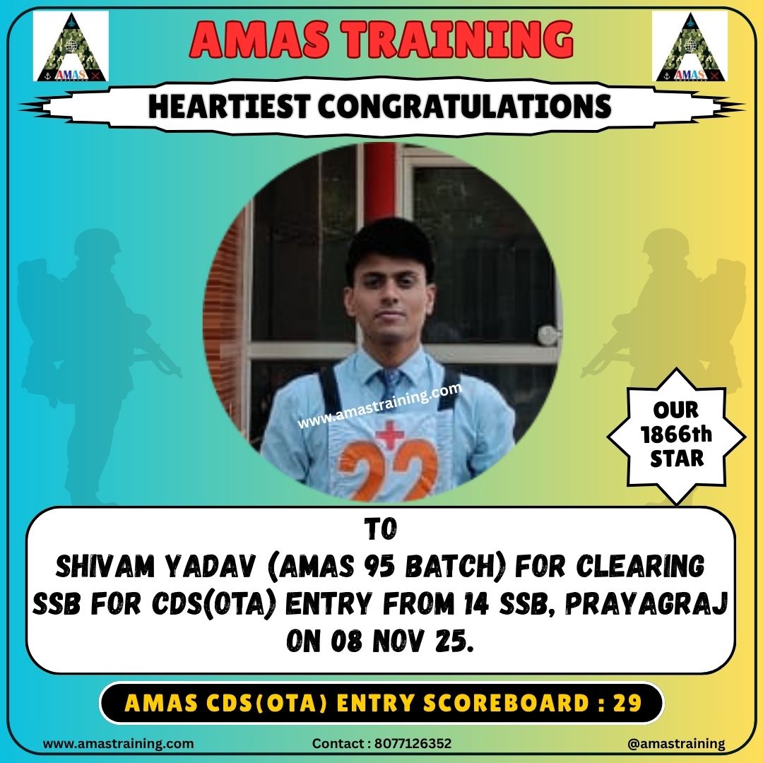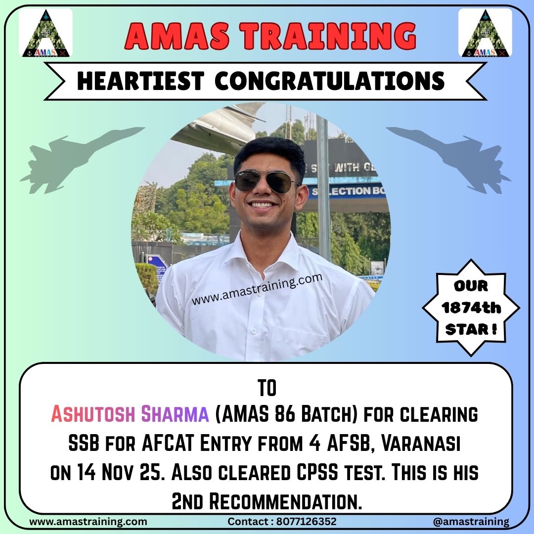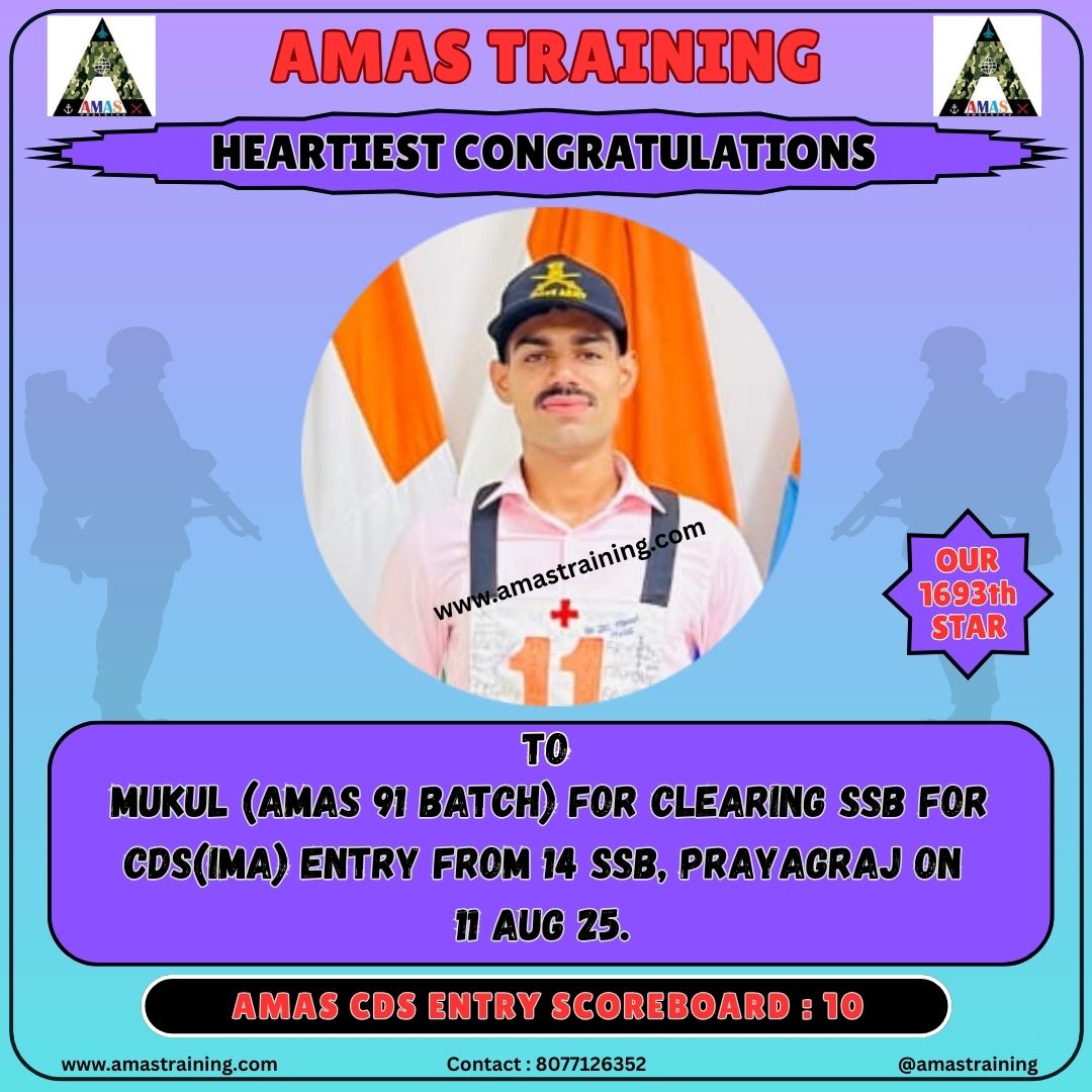 “Its really PROUD to be a part of such great ACADEMY...!! The classes are superb with all the required facilities and so COOPERATING faculty. You can even share any kind of problem with the main AUTHORITIES. All over the academv team in very INSPIRING and full of ENTHUSIASM..The most admiring part is that the tutors focus on CONCEPTUAL development..!! So I recommend students aspiring for SSB to join ”AMAS TRAINING, THE GURUKUL OF SSB" for enhancing your knowledge and to get best RESULTS..!!