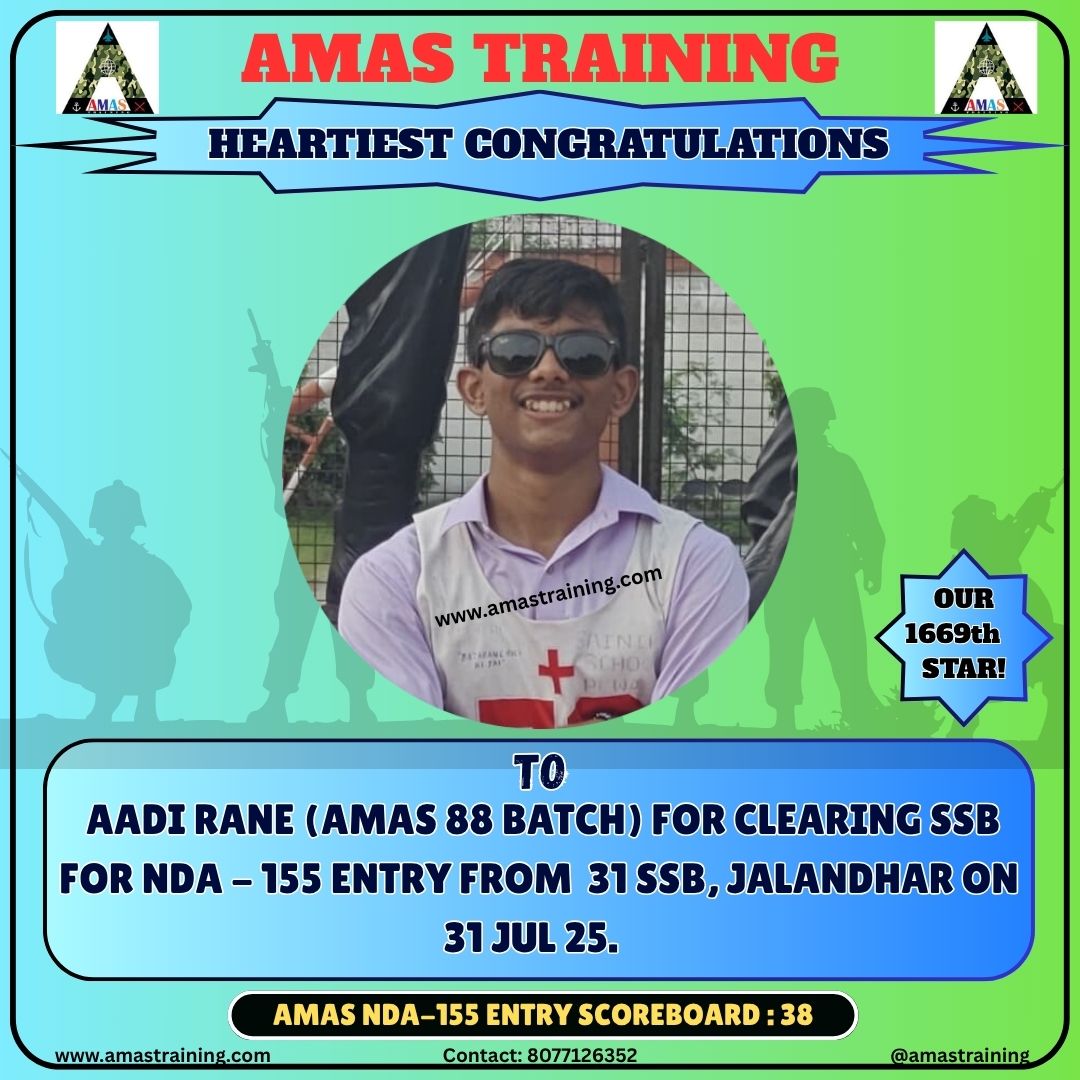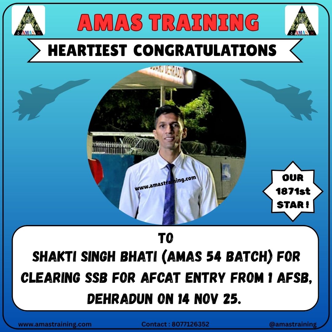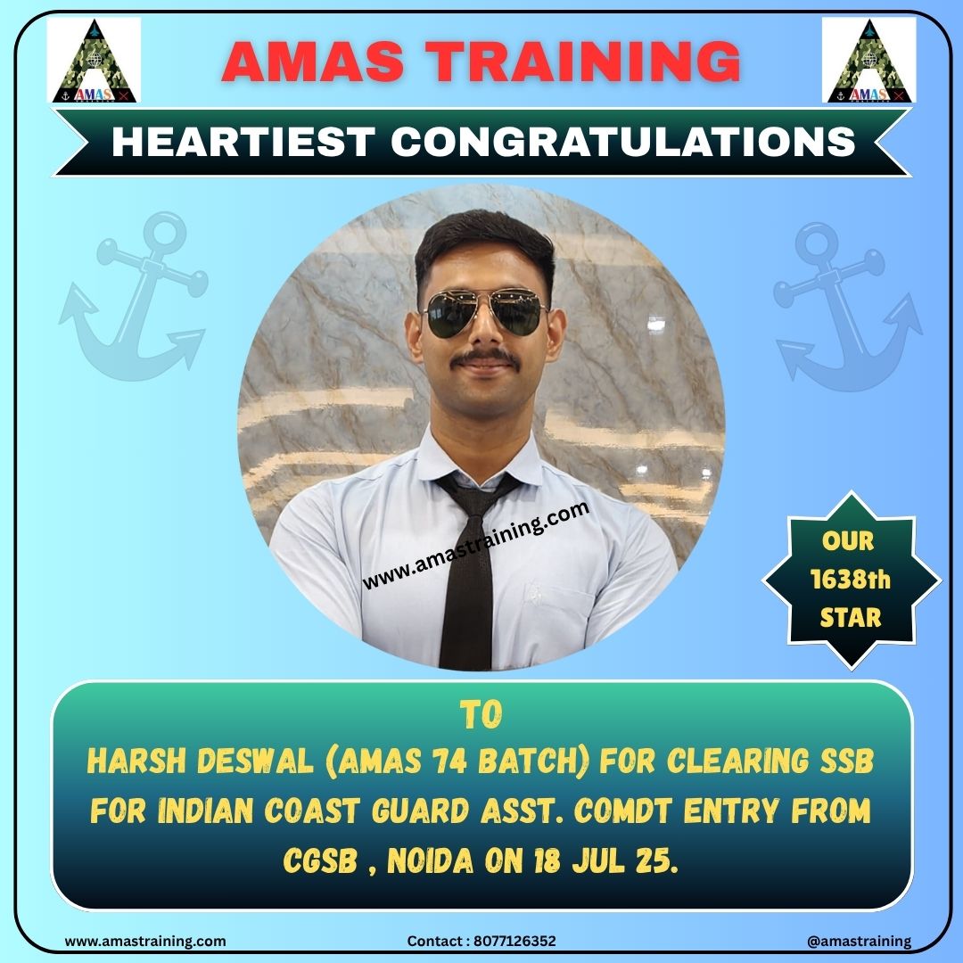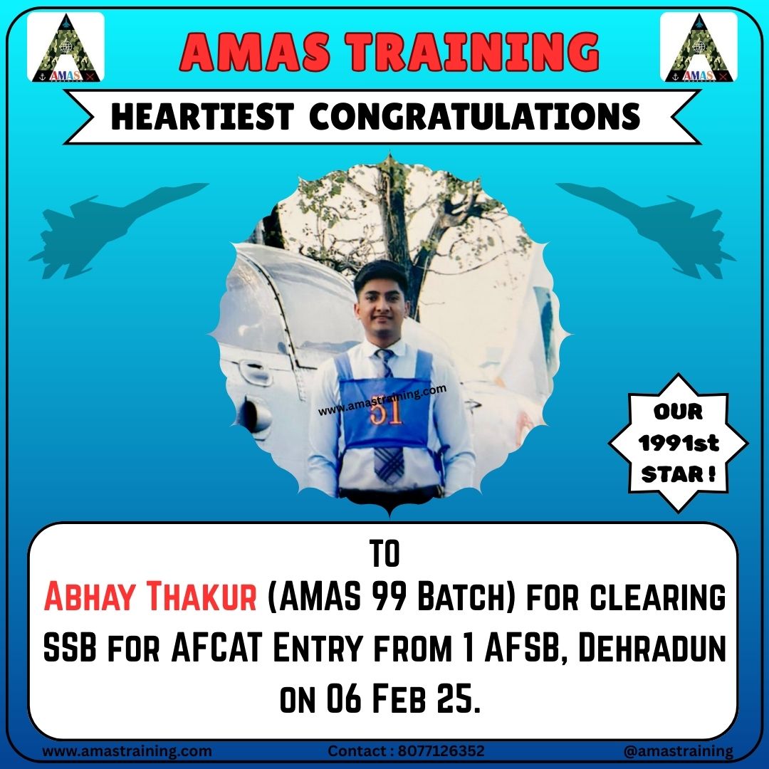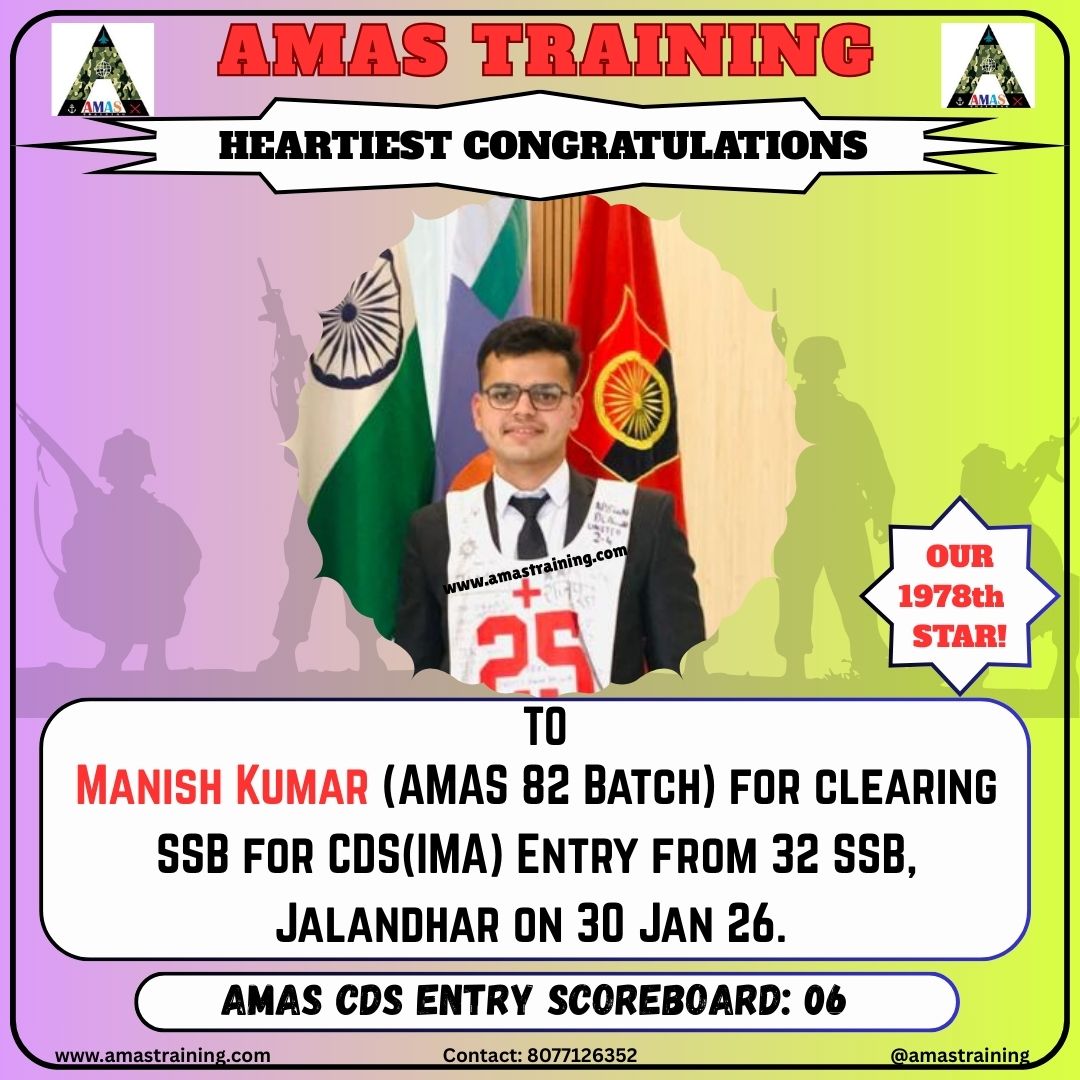 “Its really PROUD to be a part of such great ACADEMY...!! The classes are superb with all the required facilities and so COOPERATING faculty. You can even share any kind of problem with the main AUTHORITIES. All over the academv team in very INSPIRING and full of ENTHUSIASM..The most admiring part is that the tutors focus on CONCEPTUAL development..!! So I recommend students aspiring for SSB to join ”AMAS TRAINING, THE GURUKUL OF SSB" for enhancing your knowledge and to get best RESULTS..!!